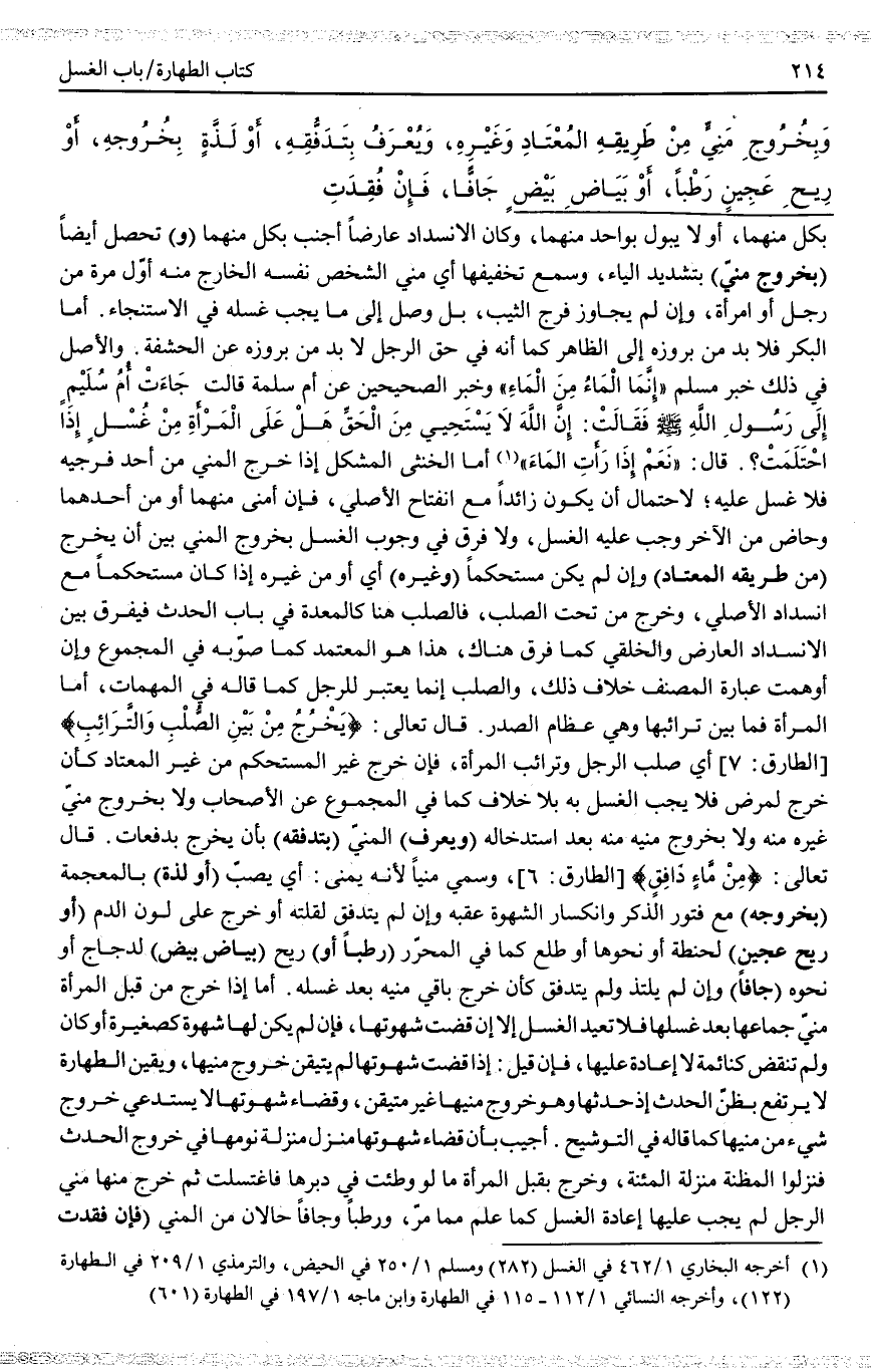 قَالَ تَعَالَى: {يَخْرُجُ مِنْ بَيْنِ الصُّلْبِ وَالتَّرَائِبِ} [الطارق: 7] أَيْ صُلْبِ الرَّجُلِ وَتَرَائِبِ الْمَرْأَةِ، فَإِنْ خَرَجَ غَيْرُ الْمُسْتَحْكِمِ مِنْ غَيْرِ الْمُعْتَادِ كَأَنْ خَرَجَ لِمَرَضٍ فَلَا يَجِبُ الْغُسْلُ بِهِ بِلَا خِلَافٍ كَمَا فِي الْمَجْمُوعِ عَنْ الْأَصْحَابِ وَلَا بِخُرُوجِ مَنِيِّ غَيْرِهِ مِنْهُ وَلَا بِخُرُوجِ مَنِيِّهِ مِنْهُ بَعْدَ اسْتِدْخَالِهِ