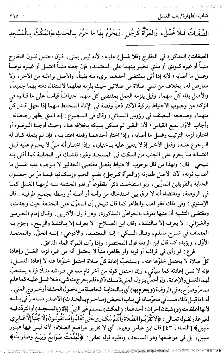 (وَيَحْرُمُ بِهَا) أَيْ بِالْجَنَابَةِ الْحَاصِلَةِ مِنْ دُخُولِ الْحَشَفَةِ أَوْ خُرُوجِ الْمَنِيِّ. أَمَّا مَا قَبْلَ ذَلِكَ فَسَيَأْتِي مُحَرَّمَاتُهُ فِي بَابِ الْحَيْضِ (مَا حَرُمَ بِالْحَدَثِ) الْأَصْغَرِ مِمَّا مَرَّ فِي بَابِهِ؛ لِأَنَّهَا أَغْلَظُ مِنْهُ (وَ) شَيْئَانِ آخَرَانِ: أَحَدُهُمَا: (الْمُكْثُ) لِمُسْلِمٍ غَيْرِ النَّبِيِّ - صَلَّى اللَّهُ عَلَيْهِ وَسَلَّمَ - (بِالْمَسْجِدِ) أَوْ التَّرَدُّدُ فِيهِ لِغَيْرِ عُذْرٍ لِقَوْلِهِ تَعَالَى: {لا تَقْرَبُوا الصَّلاةَ وَأَنْتُمْ سُكَارَى حَتَّى تَعْلَمُوا مَا تَقُولُونَ وَلا جُنُبًا إِلا عَابِرِي سَبِيلٍ} [النساء: 43] قَالَ ابْنُ عَبَّاسٍ وَغَيْرُهُ: أَيْ لَا تَقْرَبُوا مَوَاضِعَ الصَّلَاةِ؛ لِأَنَّهُ لَيْسَ فِيهَا عُبُورُ سَبِيلٍ؛ بَلْ فِي مَوَاضِعِهَا وَهُوَ الْمَسْجِدُ، وَنَظِيرُهُ قَوْله تَعَالَى: {لَهُدِّمَتْ صَوَامِعُ وَبِيَعٌ وَصَلَوَاتٌ} [الحج: 40]