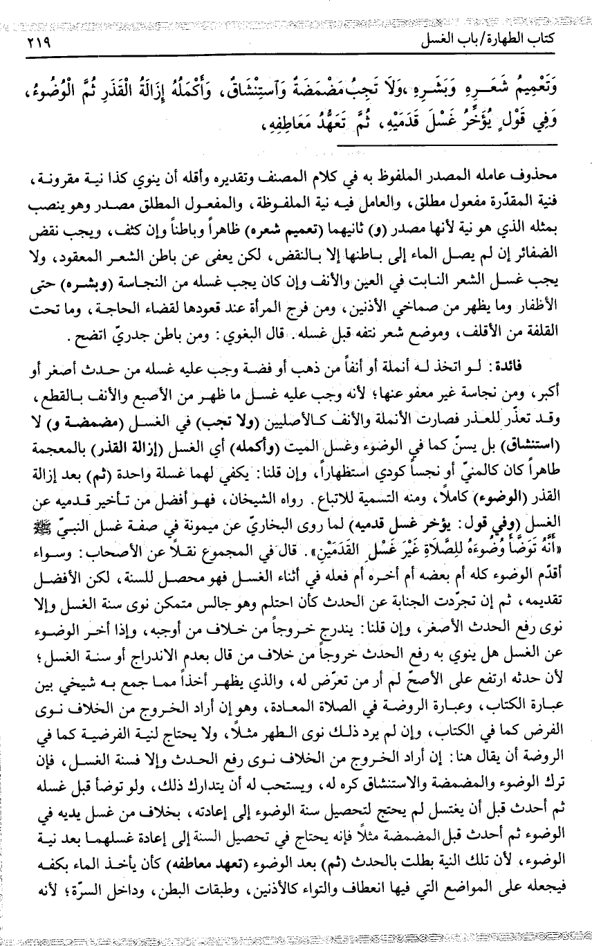 ـــــــــــــــــــــــــــــQمَحْذُوفٍ عَامِلُهُ الْمَصْدَرُ الْمَلْفُوظُ بِهِ فِي كَلَامِ الْمُصَنِّفِ وَتَقْدِيرُهُ وَأَقَلُّهُ أَنْ يَنْوِيَ كَذَا نِيَّةً مَقْرُونَةً، فَنِيَّةٌ الْمُقَدَّرَةُ مَفْعُولٌ مُطْلَقٌ، وَالْعَامِلُ فِيهِ نِيَّةٌ الْمَلْفُوظَةُ، وَالْمَفْعُولُ الْمُطْلَقُ مَصْدَرٌ وَهُوَ يُنْصَبُ بِمِثْلِهِ الَّذِي هُوَ نِيَّةٌ؛ لِأَنَّهَا مَصْدَرٌ (وَ) ثَانِيهِمَا (تَعْمِيمُ شَعْرِهِ) ظَاهِرًا وَبَاطِنًا وَإِنْ كَثُفَ، وَيَجِبُ نَقْضُ الضَّفَائِرِ إنْ لَمْ يَصِلْ الْمَاءُ إلَى بَاطِنِهَا إلَّا بِالنَّقْضِ، لَكِنْ يُعْفَى عَنْ بَاطِنِ الشَّعْرِ الْمَعْقُودِ، وَلَا يَجِبُ غَسْلُ الشَّعْرِ النَّابِتِ فِي الْعَيْنِ وَالْأَنْفِ وَإِنْ كَانَ يَجِبُ غَسْلُهُ مِنْ النَّجَاسَةِ (وَبَشَرِهِ) حَتَّى الْأَظْفَارِ وَمَا يَظْهَرُ مِنْ صِمَاخَيْ الْأُذُنَيْنِ، وَمِنْ فَرْجِ الْمَرْأَةِ عِنْدَ قُعُودِهَا لِقَضَاءِ الْحَاجَةِ، وَمَا تَحْتَ الْقَلَفَةِ مِنْ الْأَقْلَفِ، وَمَوْضِعُ شَعْرٍ نَتَفَهُ قَبْلَ غَسْلِهِ. قَالَ الْبَغَوِيّ: وَمِنْ بَاطِنِ جُدَرِيٍّ اتَّضَحَ.