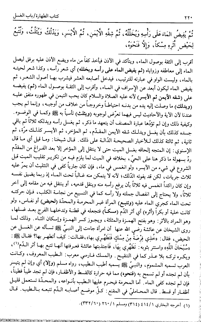 ثُمَّ الْوُضُوءُ، وَفِي قَوْلٍ يُؤَخِّرُ غَسْلَ قَدَمَيْهِ، ثُمَّ تَعَهُّدُ مَعَاطِفَهُ، ثُمَّ يُفِيضُ الْمَاءَ عَلَى رَأْسِهِ وَيُخَلِّلُهُ، ثُمَّ شِقِّهِ الْأَيْمَنِ، ثُمَّ الْأَيْسَرِ، وَيُدَلِّكُ وَيُثَلِّثُ، وَتُتْبِعُ لِحَيْضٍ أَثَرَهُ مِسْكًا، وَإِلَّا فَنَحْوَهُ.