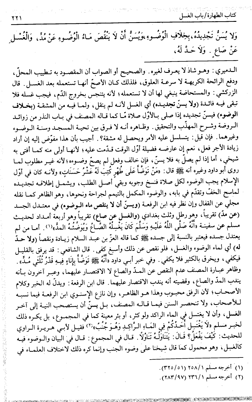 (وَيُسَنُّ أَنْ لَا يَنْقُصَ مَاءُ الْوُضُوءِ) فِي مُعْتَدِلِ الْجَسَدِ (عَنْ مُدٍّ) تَقْرِيبًا، وَهُوَ رَطْلٌ وَثُلُثٌ بَغْدَادِيٌّ (وَالْغُسْلِ عَنْ صَاعٍ) تَقْرِيبًا وَهُوَ أَرْبَعَةُ أَمْدَادٍ لِحَدِيثِ مُسْلِمٍ عَنْ سَفِينَةَ «أَنَّهُ - صَلَّى اللَّهُ عَلَيْهِ وَسَلَّمَ - كَانَ يُغَسِّلُهُ الصَّاعُ وَيُوَضِّئُهُ الْمُدُّ» (1) . أَمَّا مَنْ لَمْ يَعْتَدِلْ جَسَدُهُ فَيُعْتَبَرُ بِالنِّسْبَةِ إلَى جَسَدِهِ - صَلَّى اللَّهُ عَلَيْهِ وَسَلَّمَ - كَمَا قَالَ الْعِزُّ بْنُ عَبْدِ السَّلَامِ زِيَادَةً وَنَقْصًا (وَلَا حَدَّ لَهُ) أَيْ لِمَاءِ الْوُضُوءِ وَالْغُسْلِ، فَلَوْ نَقَصَ عَنْ ذَلِكَ وَأَسْبَغَ كَفَى.