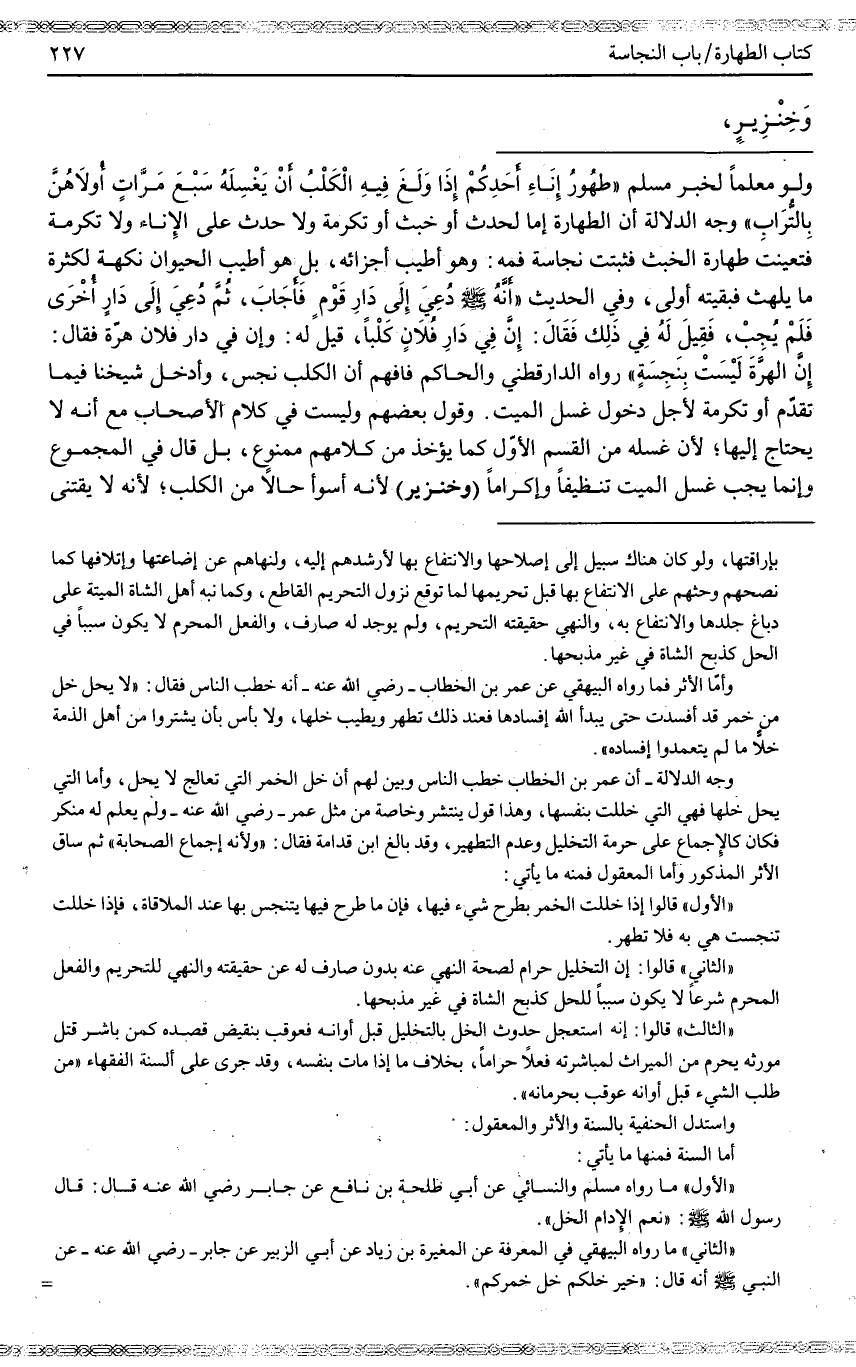 ـــــــــــــــــــــــــــــQوَلَوْ مُعَلَّمًا لِخَبَرِ مُسْلِمٍ «طَهُورُ إنَاءِ أَحَدِكُمْ إذَا وَلَغَ فِيهِ الْكَلْبُ أَنْ يَغْسِلَهُ سَبْعَ مَرَّاتٍ أُولَاهُنَّ بِالتُّرَابِ» وَجْهُ الدَّلَالَةِ أَنَّ الطَّهَارَةَ إمَّا لِحَدَثٍ أَوْ خَبَثٍ أَوْ تَكْرِمَةً وَلَا حَدَثَ عَلَى الْإِنَاءِ وَلَا تَكْرِمَةَ فَتَعَيَّنَتْ طَهَارَةُ الْخَبَثِ فَثَبَتَتْ نَجَاسَةُ فَمِهِ: وَهُوَ أَطْيَبُ أَجْزَائِهِ، بَلْ هُوَ أَطْيَبُ الْحَيَوَانِ نَكْهَةً لِكَثْرَةِ مَا يَلْهَثُ فَبَقِيَّتُهُ أَوْلَى، وَفِي الْحَدِيثِ «أَنَّهُ - صَلَّى اللَّهُ عَلَيْهِ وَسَلَّمَ - دُعِيَ إلَى دَارِ قَوْمٍ فَأَجَابَ، ثُمَّ دُعِيَ إلَى دَارٍ أُخْرَى فَلَمْ يُجِبْ، فَقِيلَ لَهُ فِي ذَلِكَ فَقَالَ: إنَّ فِي دَارِ فُلَانٍ كَلْبًا، قِيلَ لَهُ: وَإِنَّ فِي دَارِ فُلَانٍ هِرَّةً فَقَالَ: إنَّ الْهِرَّةَ لَيْسَتْ بِنَجِسَةٍ» رَوَاهُ الدَّارَقُطْنِيّ وَالْحَاكِمُ فَأَفْهَمَ أَنَّ الْكَلْبَ نَجِسٌ، وَأَدْخَلَ شَيْخُنَا فِيمَا تَقَدَّمَ أَوْ تَكْرِمَةً لِأَجْلِ دُخُولِ غُسْلِ الْمَيِّتِ. وَقَوْلُ بَعْضِهِمْ وَلَيْسَتْ فِي كَلَامِ الْأَصْحَابِ مَعَ أَنَّهُ لَا يَحْتَاجُ إلَيْهَا؛ لِأَنَّ غُسْلَهُ مِنْ الْقِسْمِ الْأَوَّلِ كَمَا يُؤْخَذُ مِنْ كَلَامِهِمْ مَمْنُوعٌ، بَلْ قَالَ فِي الْمَجْمُوعِ، وَإِنَّمَا يَجِبُ غُسْلُ الْمَيِّتِ تَنْظِيفًا وَإِكْرَامًا (وَخِنْزِيرٍ) ؛ لِأَنَّهُ أَسْوَأُ حَالًا مِنْ الْكَلْبِ؛ لِأَنَّهُ لَا يُقْتَنَى