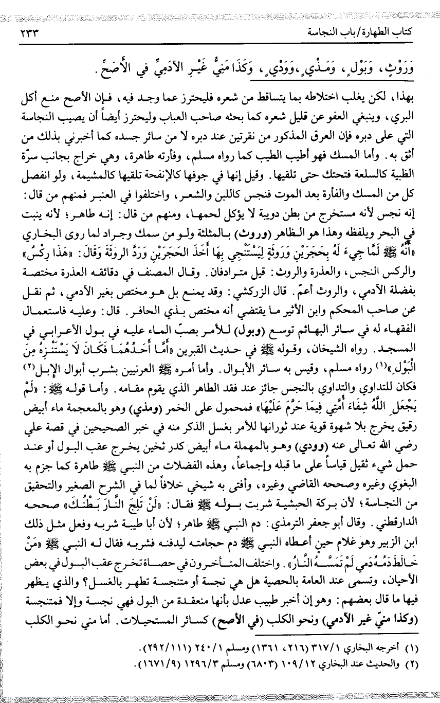 وَقَوْلِهِ - صَلَّى اللَّهُ عَلَيْهِ وَسَلَّمَ - فِي حَدِيثِ الْقَبْرَيْنِ «أَمَّا أَحَدُهُمَا فَكَانَ لَا يَسْتَنْزِهُ مِنْ الْبَوْلِ» (1) رَوَاهُ مُسْلِمٌ.