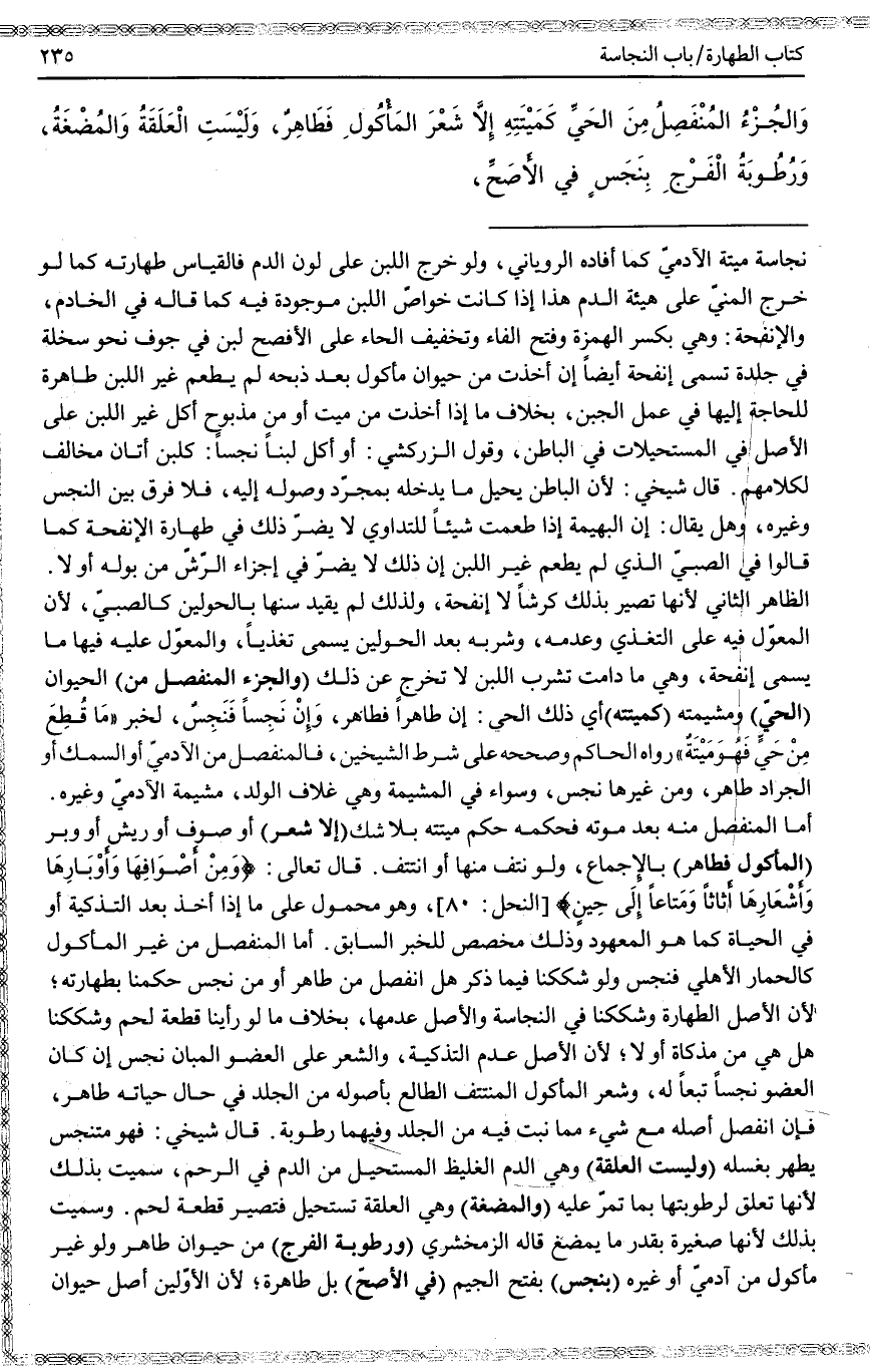 قَالَ شَيْخِي: فَهُوَ مُتَنَجِّسٌ يَطْهُرُ بِغَسْلِهِ (وَلَيْسَتْ الْعَلَقَةُ) وَهِيَ الدَّمُ الْغَلِيظُ الْمُسْتَحِيلُ مِنْ الدَّمِ فِي الرَّحِمِ، سُمِّيَتْ بِذَلِكَ؛ لِأَنَّهَا تَعْلَقُ لِرُطُوبَتِهَا بِمَا تَمُرُّ عَلَيْهِ (وَالْمُضْغَةُ) وَهِيَ الْعَلَقَةُ تَسْتَحِيلُ فَتَصِيرُ قِطْعَةَ لَحْمٍ. وَسُمِّيَتْ بِذَلِكَ؛ لِأَنَّهَا صَغِيرَةٌ بِقَدْرِ مَا يُمْضَغُ قَالَهُ الزَّمَخْشَرِيُّ (وَرُطُوبَةُ الْفَرْجِ) مِنْ حَيَوَانٍ طَاهِرٍ وَلَوْ غَيْرَ مَأْكُولٍ مِنْ آدَمِيٍّ أَوْ غَيْرِهِ (بِنَجَسٍ) بِفَتْحِ الْجِيمِ (فِي الْأَصَحِّ) بَلْ طَاهِرَةٌ؛ لِأَنَّ الْأَوَّلَيْنِ أَصْلُ حَيَوَانٍ
