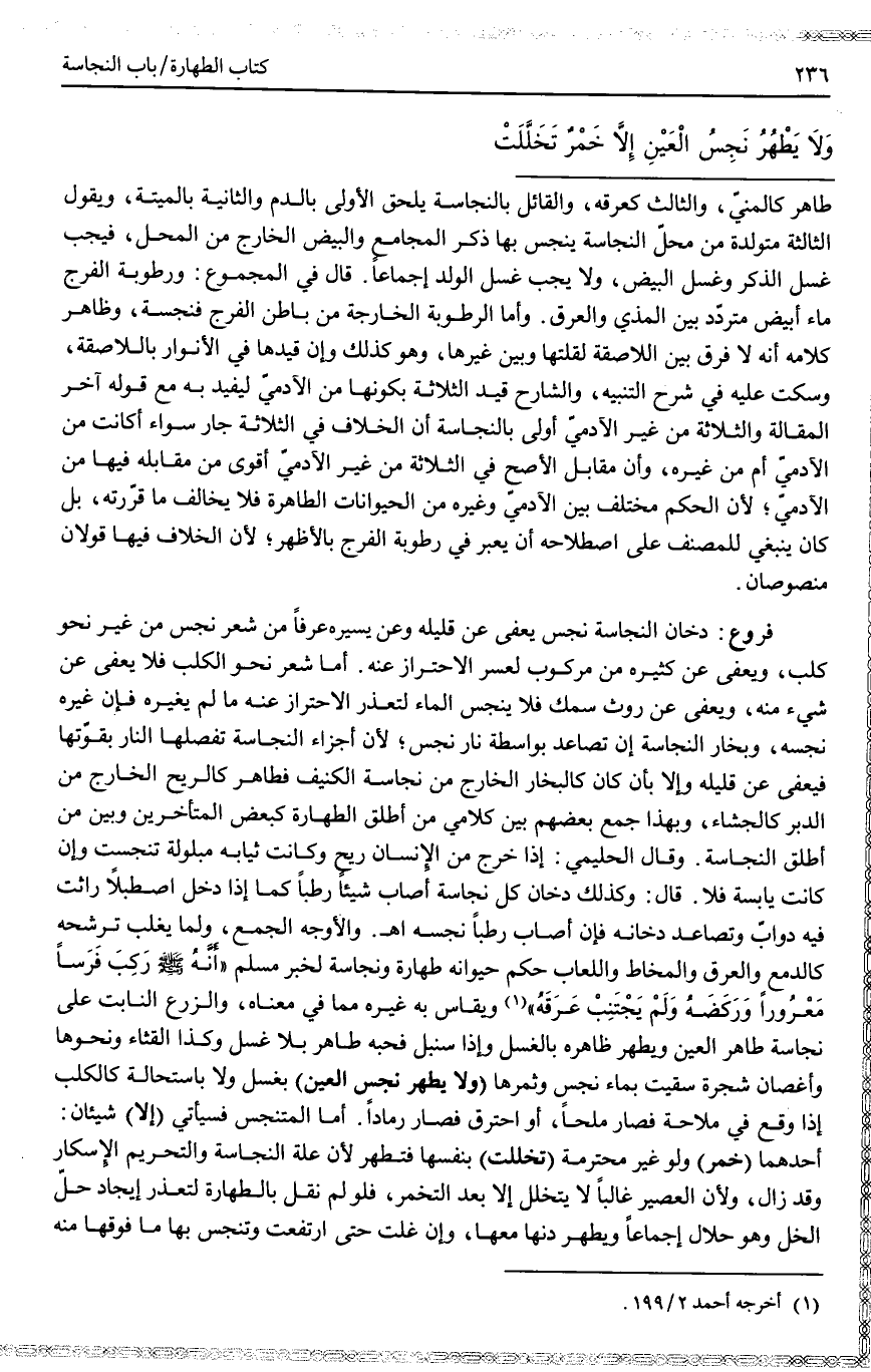 وَالْأَوْجَهُ الْجَمْعُ، وَلِمَا يَغْلِبُ تَرَشُّحُهُ كَالدَّمْعِ وَالْعَرَقِ وَالْمُخَاطِ وَاللُّعَابِ حُكْمُ حَيَوَانِهِ طَهَارَةً وَنَجَاسَةً لِخَبَرِ مُسْلِمٍ «أَنَّهُ - صَلَّى اللَّهُ عَلَيْهِ وَسَلَّمَ - رَكِبَ فَرَسًا مَعْرُورًا وَرَكَضَهُ وَلَمْ يَجْتَنِبْ عَرَقَهُ» (1) وَيُقَاسُ بِهِ غَيْرُهُ مِمَّا فِي مَعْنَاهُ، وَالزَّرْعُ النَّابِتُ عَلَى نَجَاسَةٍ طَاهِرُ الْعَيْنِ وَيَطْهُرُ ظَاهِرُهُ بِالْغَسْلِ وَإِذَا سَنْبَلَ فَحَبُّهُ طَاهِرٌ بِلَا غَسْلٍ وَكَذَا الْقِثَّاءُ وَنَحْوُهَا وَأَغْصَانُ شَجَرَةٍ سُقِيَتْ بِمَاءٍ نَجِسٍ وَثَمَرُهَا