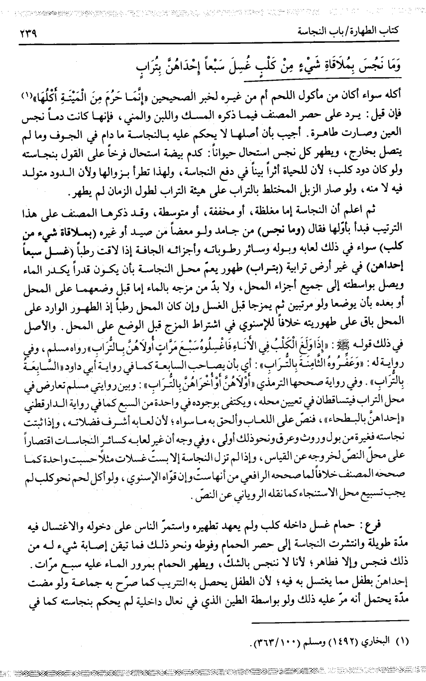 وَمَا نَجُسَ بِمُلَاقَاةِ شَيْءٍ مِنْ كَلْبٍ غُسِلَ سَبْعًا إحْدَاهُنَّ بِتُرَابٍ