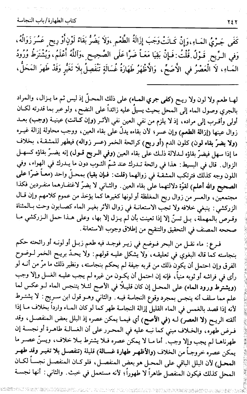 ـــــــــــــــــــــــــــــQلَهَا طَعْمٌ وَلَا لَوْنٌ وَلَا رِيحٌ (كَفَى جَرْيُ الْمَاءِ) عَلَى ذَلِكَ الْمَحَلِّ إذْ لَيْسَ ثَمَّ مَا يُزَالُ، وَالْمُرَادُ بِالْجَرْيِ وُصُولُ الْمَاءِ إلَى الْمَحَلِّ بِحَيْثُ يَسِيلُ عَلَيْهِ زَائِدًا عَلَى النَّضْحِ، وَلَوْ عَبَّرَ بِمَا قَدَّرْتُهُ لَكَانَ أَوْلَى وَأَقْرَبَ إلَى مُرَادِهِ، إذْ لَا يَلْزَمُ مِنْ نَفْيِ الْعَيْنِ نَفْيُ الْأَثَرِ (وَإِنْ كَانَتْ) عَيْنِيَّةً (وَجَبَ) بَعْدَ زَوَالِ عَيْنِهَا (إزَالَةُ الطَّعْمِ) وَإِنْ عَسُرَ؛ لِأَنَّ بَقَاءَهُ يَدُلُّ عَلَى بَقَاءِ الْعَيْنِ، وَوَجَبَ مُحَاوَلَةُ إزَالَةِ غَيْرِهِ (وَلَا يَضُرُّ بَقَاءُ لَوْنٍ) كَلَوْنِ الدَّمِ (أَوْ رِيحٍ) كَرَائِحَةِ الْخَمْرِ (عَسُرَ زَوَالُهُ) فَيَطْهُرُ لِلْمَشَقَّةِ، بِخِلَافِ مَا إذَا سَهُلَ فَيَضُرُّ بَقَاؤُهُ لِدَلَالَةِ ذَلِكَ عَلَى بَقَاءِ الْعَيْنِ (وَفِي الرِّيحِ قَوْلٌ) أَنَّهُ يَضُرُّ بَقَاؤُهَا كَسَهْلِ الزَّوَالِ.