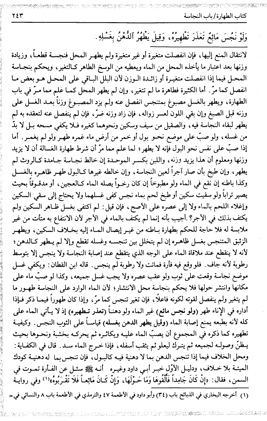 (وَلَوْ نَجُسَ مَائِعٌ) غَيْرُ الْمَاءِ وَلَوْ دُهْنًا (تَعَذَّرَ تَطْهِيرُهُ) إذْ لَا يَأْتِي الْمَاءُ عَلَى كُلِّهِ؛ لِأَنَّهُ بِطَبْعِهِ يَمْنَعُ إصَابَةَ الْمَاءِ (وَقِيلَ يَطْهُرُ الدُّهْنُ بِغَسْلِهِ) قِيَاسًا عَلَى الثَّوْبِ النَّجِسِ. وَكَيْفِيَّةُ تَطْهِيرِهِ كَمَا ذَكَرَهُ فِي الْمَجْمُوعِ أَنْ يَصُبَّ الْمَاءَ عَلَيْهِ وَيُكَاثِرَهُ ثُمَّ يُحَرِّكَهُ بِخَشَبَةٍ وَنَحْوِهَا بِحَيْثُ يَظُنُّ وُصُولَهُ لِجَمِيعِهِ ثُمَّ يُتْرَكَ لِيَعْلُوَ ثُمَّ يَثْقُبُ أَسْفَلَهُ، فَإِذَا خَرَجَ الْمَاءُ سُدَّ.