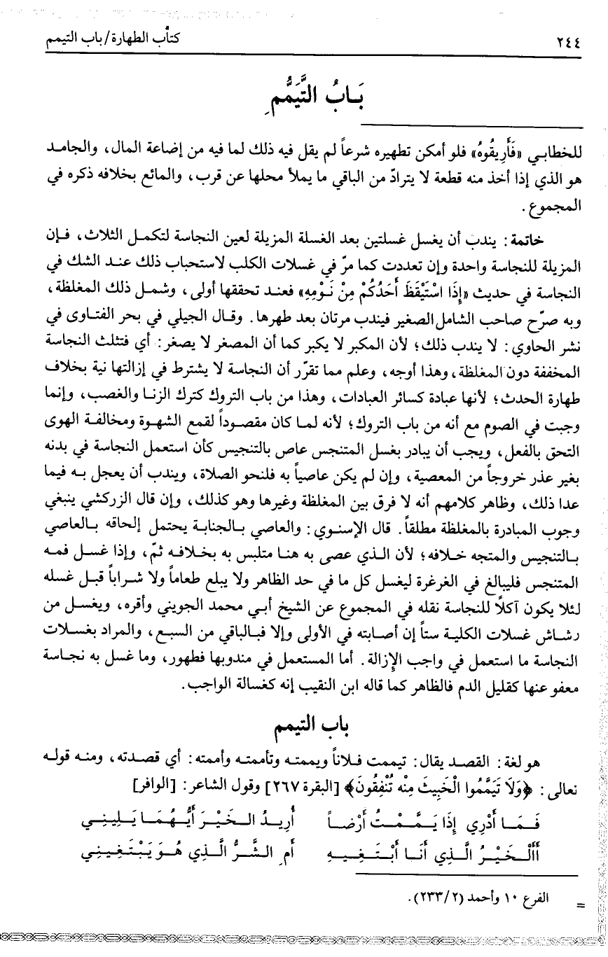 (بَابُ التَّيَمُّمِ) هُوَ لُغَةً: الْقَصْدُ يُقَالُ: تَيَمَّمْتُ فُلَانًا وَيَمَّمَتْهُ وَتَأَمَّمْتُهُ وَأَمَمْتُهُ: أَيْ قَصَدْتُهُ، وَمِنْهُ قَوْله تَعَالَى: {وَلا تَيَمَّمُوا الْخَبِيثَ مِنْهُ تُنْفِقُونَ} [البقرة: 267] وَقَوْلُ الشَّاعِرِ: [الْوَافِرُ]