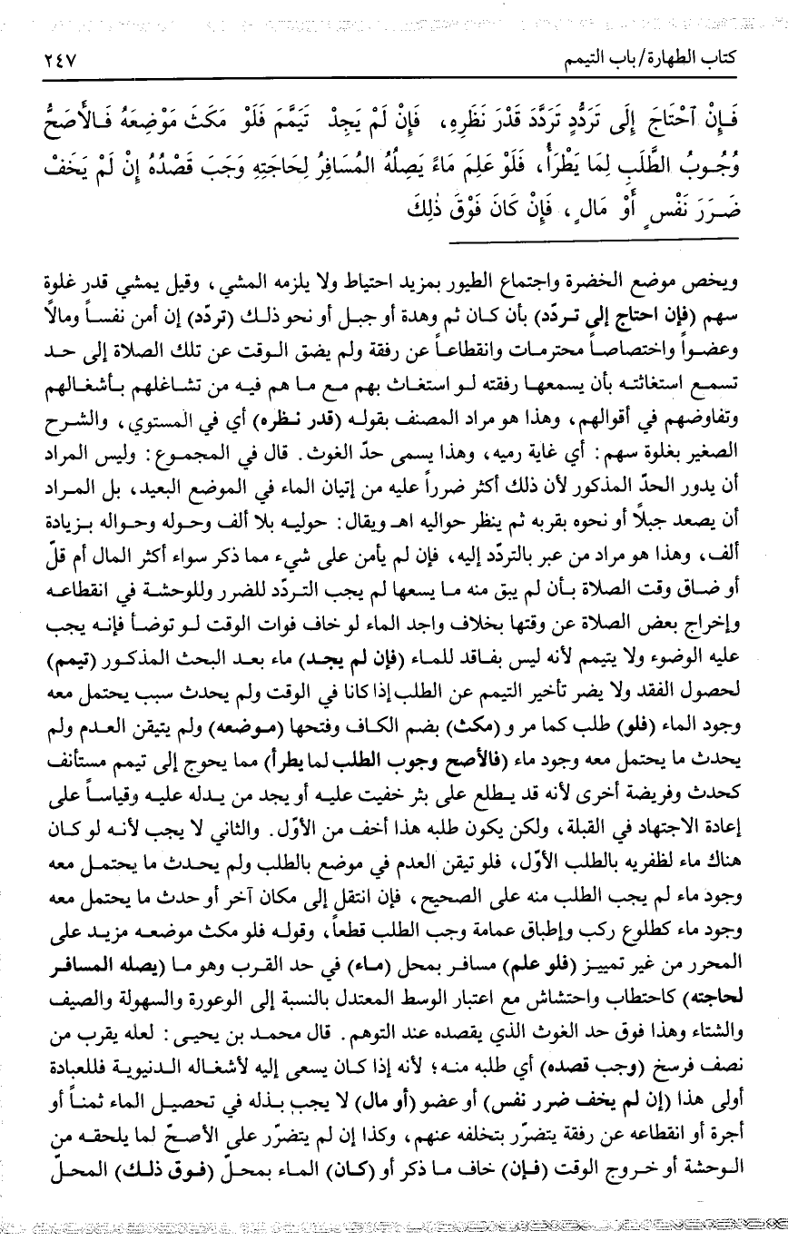 قَالَ مُحَمَّدُ بْنُ يَحْيَى: لَعَلَّهُ يَقْرُبُ مِنْ نِصْفِ فَرْسَخٍ (وَجَبَ قَصْدُهُ) أَيْ طَلَبُهُ مِنْهُ؛ لِأَنَّهُ إذَا كَانَ يَسْعَى إلَيْهِ لِأَشْغَالِهِ الدُّنْيَوِيَّةِ فَلِلْعِبَادَةِ أَوْلَى هَذَا (إنْ لَمْ يَخَفْ ضَرَرَ نَفْسٍ) أَوْ عُضْوٍ (أَوْ مَالٍ) لَا يَجِبُ بَذْلُهُ فِي تَحْصِيلِ الْمَاءِ ثَمَنًا أَوْ أُجْرَةً أَوْ انْقِطَاعَهُ عَنْ رُفْقَةٍ يَتَضَرَّرُ بِتَخَلُّفِهِ عَنْهُمْ، وَكَذَا إنْ لَمْ يَتَضَرَّرْ عَلَى الْأَصَحِّ لِمَا يَلْحَقُهُ مِنْ الْوَحْشَةِ أَوْ خُرُوجِ الْوَقْتِ (فَإِنْ) خَافَ مَا ذُكِرَ أَوْ (كَانَ) الْمَاءُ بِمَحَلٍّ (فَوْقَ ذَلِكَ) الْمَحَلِّ