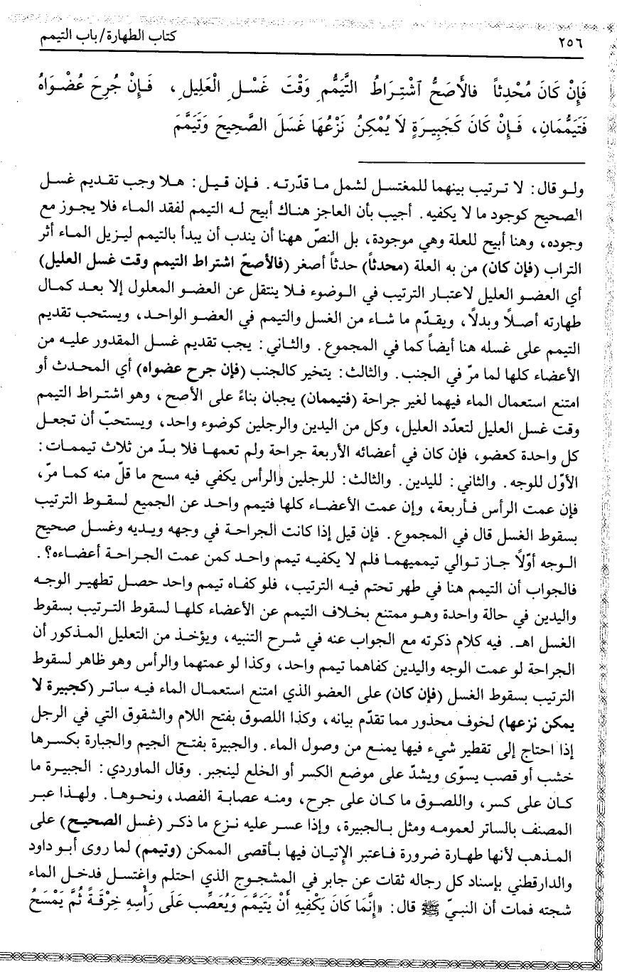 فِيهِ كَلَامٌ ذَكَرْتُهُ مَعَ الْجَوَابِ عَنْهُ فِي شَرْحِ التَّنْبِيهِ، وَيُؤْخَذُ مِنْ التَّعْلِيلِ الْمَذْكُورِ أَنَّ الْجِرَاحَ لَوْ عَمَّتْ الْوَجْهَ وَالْيَدَيْنِ كَفَاهُمَا تَيَمُّمٌ وَاحِدٌ، وَكَذَا لَوْ عَمَّتْهُمَا الرَّأْسُ وَهُوَ ظَاهِرٌ لِسُقُوطِ التَّرْتِيبِ بِسُقُوطِ الْغَسْلِ