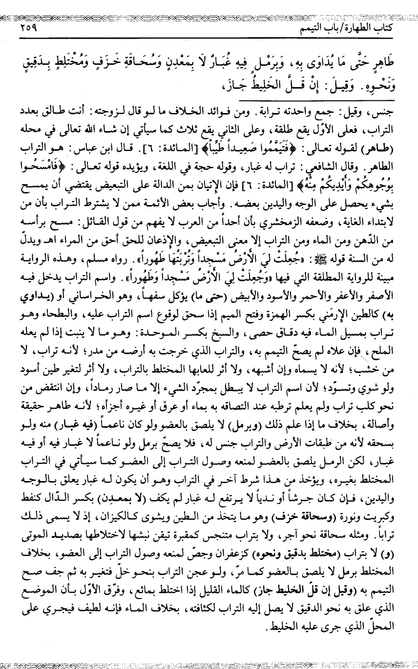 وَاسْمُ التُّرَابِ يَدْخُلُ فِيهِ الْأَصْفَرُ وَالْأَعْفَرُ وَالْأَحْمَرُ وَالْأَسْوَدُ وَالْأَبْيَضُ (حَتَّى مَا) يُؤْكَلُ سَفَهًا، وَهُوَ الْخُرَاسَانِيُّ أَوْ (يُدَاوَى بِهِ) كَالطِّينِ الْإِرْمَنِي بِكَسْرِ الْهَمْزَةِ وَفَتْحِ الْمِيمِ إذَا سُحِقَ لِوُقُوعِ اسْمِ التُّرَابِ عَلَيْهِ، وَالْبَطْحَاءِ وَهُوَ تُرَابٌ بِمَسِيلِ الْمَاءِ فِيهِ دِقَاقُ حَصًى، وَالسَّبِخُ بِكَسْرِ الْمُوَحَّدَةِ: وَهُوَ مَا لَا يَنْبُتُ إذَا لَمْ يَعْلُهُ الْمِلْحُ، فَإِنْ عَلَاهُ لَمْ يَصِحَّ التَّيَمُّمُ بِهِ، وَالتُّرَابُ الَّذِي خَرَجَتْ بِهِ أَرْضُهُ مِنْ مَدَرٍ؛ لِأَنَّهُ تُرَابٌ، لَا مِنْ خَشَبٍ؛ لِأَنَّهُ لَا يُسَمَّاهُ وَإِنْ أَشْبَهَهُ، وَلَا أَثَرَ لِلُعَابِهَا الْمُخْتَلَطِ بِالتُّرَابِ، وَلَا أَثَرَ لِتَغَيُّرِ طِينٍ أَسْوَدَ وَلَوْ شُوِيَ وَتَسَوَّدَ؛ لِأَنَّ اسْمَ التُّرَابِ لَا يَبْطُلُ بِمُجَرَّدِ الشَّيْءِ إلَّا مَا صَارَ رَمَادًا، وَإِنْ انْتَقَضَ مِنْ نَحْوِ كَلْبِ تُرَابٍ، وَلَمْ يُعْلَمْ تَرَطُّبُهُ عِنْدَ الْتِصَاقِهِ بِهِ بِمَاءٍ أَوْ عَرَقٍ أَوْ غَيْرِهِ أَجْزَأَهُ؛ لِأَنَّهُ طَاهِرٌ حَقِيقَةً وَأَصَالَةً، بِخِلَافِ مَا إذَا عُلِمَ ذَلِكَ (وَبِرَمْلٍ) لَا يَلْصَقُ بِالْعُضْوِ وَلَوْ كَانَ نَاعِمًا (فِيهِ غُبَارٌ) مِنْهُ وَلَوْ بِسَحْقِهِ لِأَنَّهُ مِنْ طَبَقَاتِ الْأَرْضِ وَالتُّرَابُ جِنْسٌ لَهُ، فَلَا يَصِحُّ بِرَمْلٍ وَلَوْ نَاعِمًا لَا غُبَارَ فِيهِ أَوْ فِيهِ غُبَارٌ، لَكِنَّ الرَّمْلَ يَلْصَقُ بِالْعُضْوِ لِمَنْعِهِ وُصُولَ التُّرَابِ إلَى الْعُضْوِ كَمَا سَيَأْتِي فِي التُّرَابِ الْمُخْتَلِطِ بِغَيْرِهِ، وَيُؤْخَذُ مِنْ هَذَا شَرْطٌ آخَرُ فِي التُّرَابِ وَهُوَ أَنْ يَكُونَ لَهُ غُبَارٌ يَعْلَقُ بِالْوَجْهِ وَالْيَدَيْنِ، فَإِنْ كَانَ جَرْشًا أَوْ نَدِيًا لَا يَرْتَفِعُ لَهُ غُبَارٌ لَمْ يَكْفِ (لَا بِمَعْدِنِ) بِكَسْرِ الدَّالِ كَنَفْطٍ وَكِبْرِيتٍ وَنُورَةٍ (وَسِحَاقَةِ خَزَفٍ) وَهُوَ مَا يُتَّخَذُ مِنْ الطِّينِ وَيُشْوَى كَالْكِيزَانِ، إذْ لَا يُسَمَّى ذَلِكَ تُرَابًا. وَمِثْلُهُ سِحَاقَةُ نَحْوِ آجُرٍّ، وَلَا بِتُرَابٍ مُتَنَجِّسٍ كَمَقْبَرَةٍ تُيُقِّنَ نَبْشُهَا لِاخْتِلَاطِهَا بِصَدِيدِ الْمَوْتَى (وَ) لَا بِتُرَابٍ (مُخْتَلِطٍ بِدَقِيقٍ وَنَحْوِهِ) كَزَعْفَرَانٍ وَجِصٍّ لِمَنْعِهِ وُصُولَ التُّرَابِ إلَى الْعُضْوِ، بِخِلَافِ الْمُخْتَلِطِ بِرَمْلٍ لَا يَلْصِقُ بِالْعُضْوِ كَمَا مَرَّ، وَلَوْ عُجِنَ التُّرَابُ بِنَحْوِ خَلٍّ فَتَغَيَّرَ بِهِ ثُمَّ جَفَّ صَحَّ التَّيَمُّمُ بِهِ (وَقِيلَ إنْ قَلَّ الْخَلِيطُ جَازَ) كَالْمَاءِ الْقَلِيلِ إذَا اخْتَلَطَ بِمَائِعٍ، وَفُرِّقَ الْأَوَّلُ بِأَنَّ الْمَوْضِعَ الَّذِي عَلِقَ بِهِ نَحْوُ الدَّقِيقِ لَا يَصِلُ إلَيْهِ التُّرَابُ لِكَثَافَتِهِ، بِخِلَافِ الْمَاءِ فَإِنَّهُ لَطِيفٌ فَيَجْرِي عَلَى الْمَحَلِّ الَّذِي جَرَى عَلَيْهِ الْخَلِيطُ.