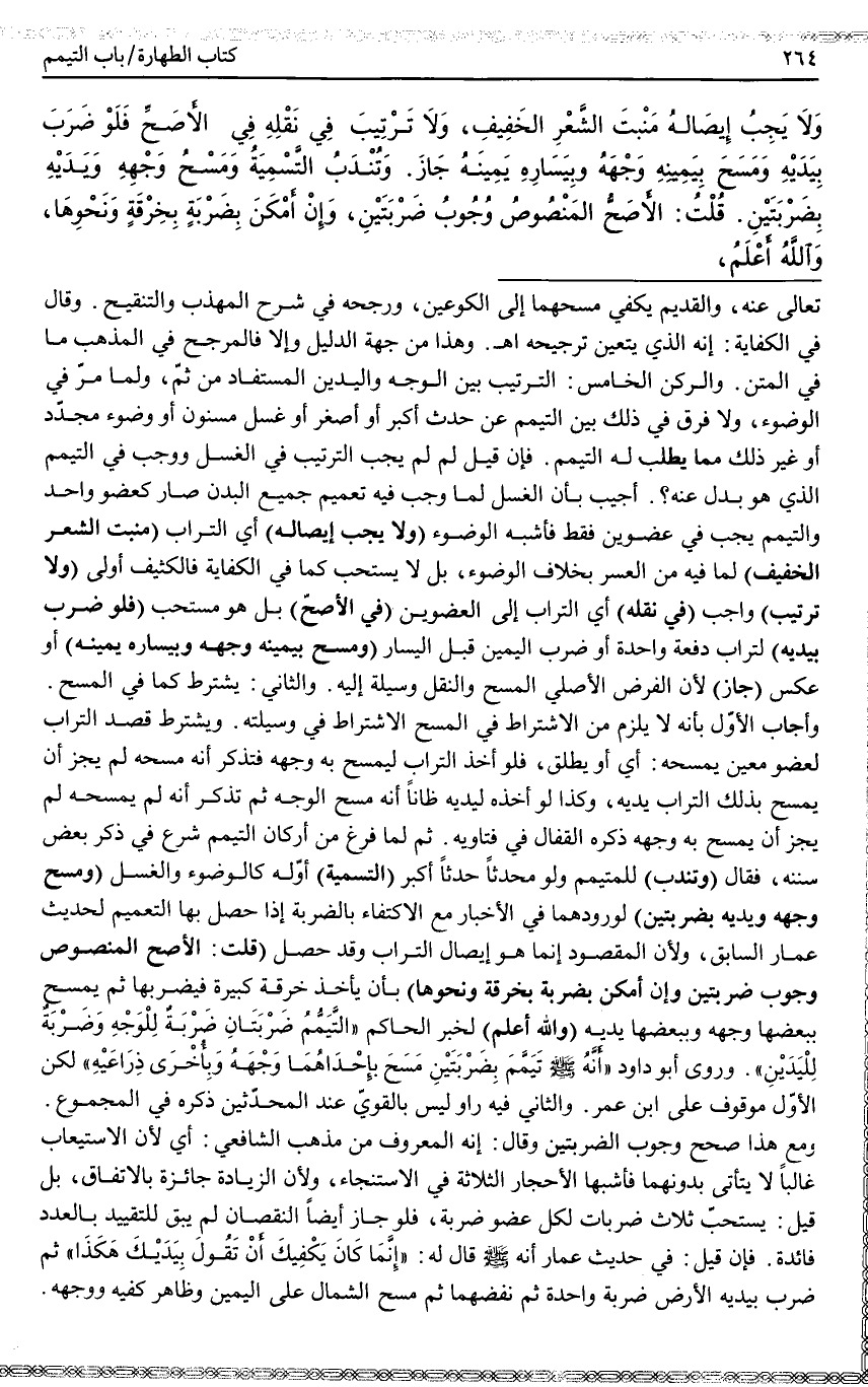 وَتُنْدَبُ التَّسْمِيَةُ وَمَسْحُ وَجْهِهِ وَيَدَيْهِ بِضَرْبَتَيْنِ. قُلْتُ: الْأَصَحُّ الْمَنْصُوصُ وُجُوبُ ضَرْبَتَيْنِ، وَإِنْ أَمْكَنَ بِضَرْبَةٍ بِخِرْقَةٍ وَنَحْوِهَا، وَاَللَّهُ أَعْلَمُ،