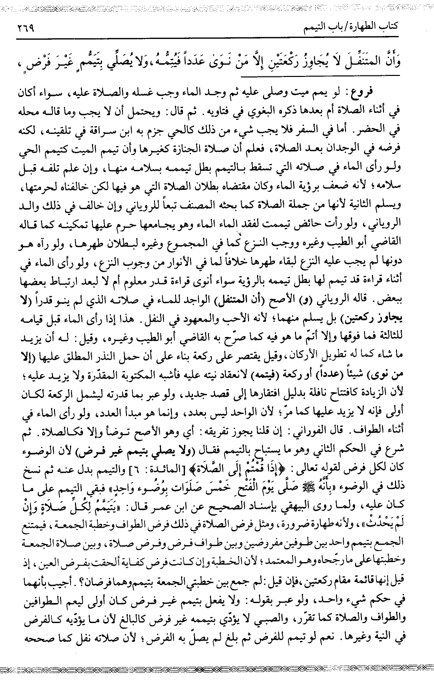 فُرُوعٌ: لَوْ يُمِّمَ مَيِّتٌ وَصُلِّيَ عَلَيْهِ ثُمَّ وُجِدَ الْمَاءُ وَجَبَ غُسْلُهُ وَالصَّلَاةُ عَلَيْهِ، سَوَاءٌ أَكَانَ فِي أَثْنَاءِ الصَّلَاةِ أَمْ بَعْدَهَا ذَكَرَهُ الْبَغَوِيّ فِي فَتَاوِيهِ. ثُمَّ قَالَ: وَيُحْتَمَلُ أَنْ لَا يَجِبَ وَمَا قَالَهُ مَحَلُّهُ فِي الْحَضَرِ. أَمَّا فِي السَّفَرِ فَلَا يَجِبُ شَيْءٌ مِنْ ذَلِكَ كَالْحَيِّ جَزَمَ بِهِ ابْنُ سُرَاقَةَ فِي تَلْقِينِهِ، لَكِنَّهُ فَرَضَهُ فِي الْوِجْدَانِ بَعْدَ الصَّلَاةِ، فَعُلِمَ أَنَّ صَلَاةَ الْجِنَازَةِ كَغَيْرِهَا وَأَنَّ تَيَمُّمَ الْمَيِّتِ كَتَيَمُّمِ الْحَيِّ.