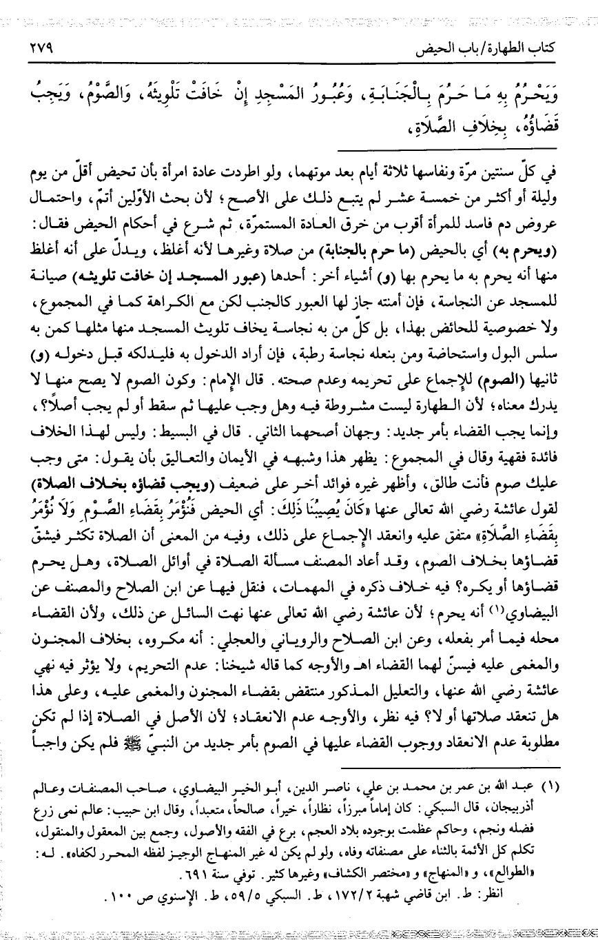 ثُمَّ شَرَعَ فِي أَحْكَامِ الْحَيْضِ فَقَالَ: (وَيَحْرُمُ بِهِ) أَيْ بِالْحَيْضِ (مَا حَرُمَ بِالْجَنَابَةِ) مِنْ صَلَاةٍ وَغَيْرِهَا؛ لِأَنَّهُ أَغْلَظُ، وَيَدُلُّ عَلَى أَنَّهُ أَغْلَظُ مِنْهَا أَنَّهُ يَحْرُمُ بِهِ مَا يَحْرُمُ بِهَا (وَ) أَشْيَاءُ أُخَرُ: أَحَدُهَا (عُبُورُ الْمَسْجِدِ إنْ خَافَتْ تَلْوِيثَهُ) صِيَانَةً لِلْمَسْجِدِ عَنْ النَّجَاسَةِ، فَإِنْ أَمِنَتْهُ جَازَ لَهَا الْعُبُورُ كَالْجُنُبِ لَكِنْ مَعَ الْكَرَاهَةِ كَمَا فِي الْمَجْمُوعِ، وَلَا خُصُوصِيَّةَ لِلْحَائِضِ بِهَذَا، بَلْ كُلُّ مَنْ بِهِ نَجَاسَةٌ يُخَافُ تَلْوِيثُ الْمَسْجِدِ مِنْهَا مِثْلُهَا كَمَنْ بِهِ سَلَسُ الْبَوْلِ وَاسْتِحَاضَةٌ وَمَنْ بِنَعْلِهِ نَجَاسَةٌ رَطْبَةٌ، فَإِنْ أَرَادَ الدُّخُولَ بِهِ فَلْيُدَلِّكْهُ قَبْلَ دُخُولِهِ (وَ) ثَانِيهَا (الصَّوْمُ) لِلْإِجْمَاعِ عَلَى تَحْرِيمِهِ وَعَدَمِ صِحَّتِهِ.