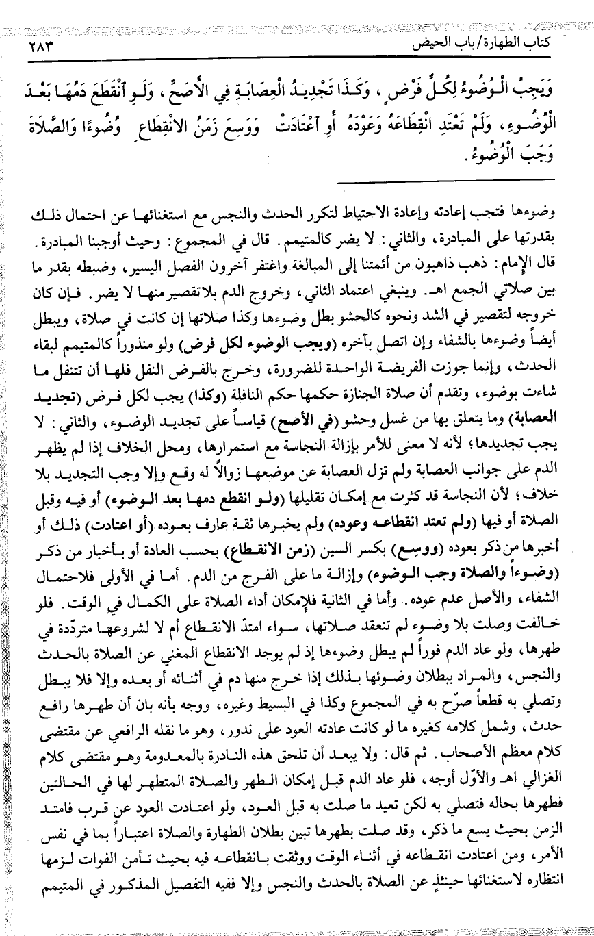 وَيَنْبَغِي اعْتِمَادُ الثَّانِي، وَخُرُوجُ الدَّمِ بِلَا تَقْصِيرٍ مِنْهَا لَا يَضُرُّ. فَإِنْ كَانَ خُرُوجُهُ لِتَقْصِيرٍ فِي الشَّدِّ وَنَحْوِهِ كَالْحَشْوِ بَطَلَ وُضُوءُهَا وَكَذَا صَلَاتُهَا إنْ كَانَتْ فِي صَلَاةٍ، وَيَبْطُلُ أَيْضًا وُضُوءُهَا بِالشِّفَاءِ وَإِنْ اتَّصَلَ بِآخِرِهِ (وَيَجِبُ الْوُضُوءُ لِكُلِّ فَرْضٍ) وَلَوْ مَنْذُورًا كَالْمُتَيَمِّمِ لِبَقَاءِ الْحَدَثِ، وَإِنَّمَا جُوِّزَتْ الْفَرِيضَةُ الْوَاحِدَةُ لِلضَّرُورَةِ، وَخَرَجَ بِالْفَرْضِ النَّفَلُ فَلَهَا أَنْ تَتَنَفَّلَ مَا شَاءَتْ بِوُضُوءٍ، وَتَقَدَّمَ أَنَّ صَلَاةَ الْجِنَازَةِ حُكْمُهَا حُكْمُ النَّافِلَةِ (وَكَذَا) يَجِبُ لِكُلِّ فَرْضٍ (تَجْدِيدُ الْعِصَابَةِ) وَمَا يَتَعَلَّقُ بِهَا مِنْ غَسْلٍ وَحَشْوٍ (فِي الْأَصَحِّ) قِيَاسًا عَلَى تَجْدِيدِ الْوُضُوءِ، وَالثَّانِي: لَا يَجِبُ تَجْدِيدُهَا؛ لِأَنَّهُ لَا مَعْنَى لِلْأَمْرِ بِإِزَالَةِ النَّجَاسَةِ مَعَ اسْتِمْرَارِهَا، وَمَحَلُّ الْخِلَافِ إذَا لَمْ يَظْهَرْ الدَّمُ عَلَى جَوَانِبِ الْعِصَابَةِ وَلَمْ تُزَلْ الْعِصَابَةُ عَنْ مَوْضِعِهَا زَوَالًا لَهُ وَقْعٌ وَإِلَّا وَجَبَ التَّجْدِيدُ بِلَا خِلَافٍ؛ لِأَنَّ النَّجَاسَةَ قَدْ كَثُرَتْ مَعَ إمْكَانَ تَقْلِيلِهَا.