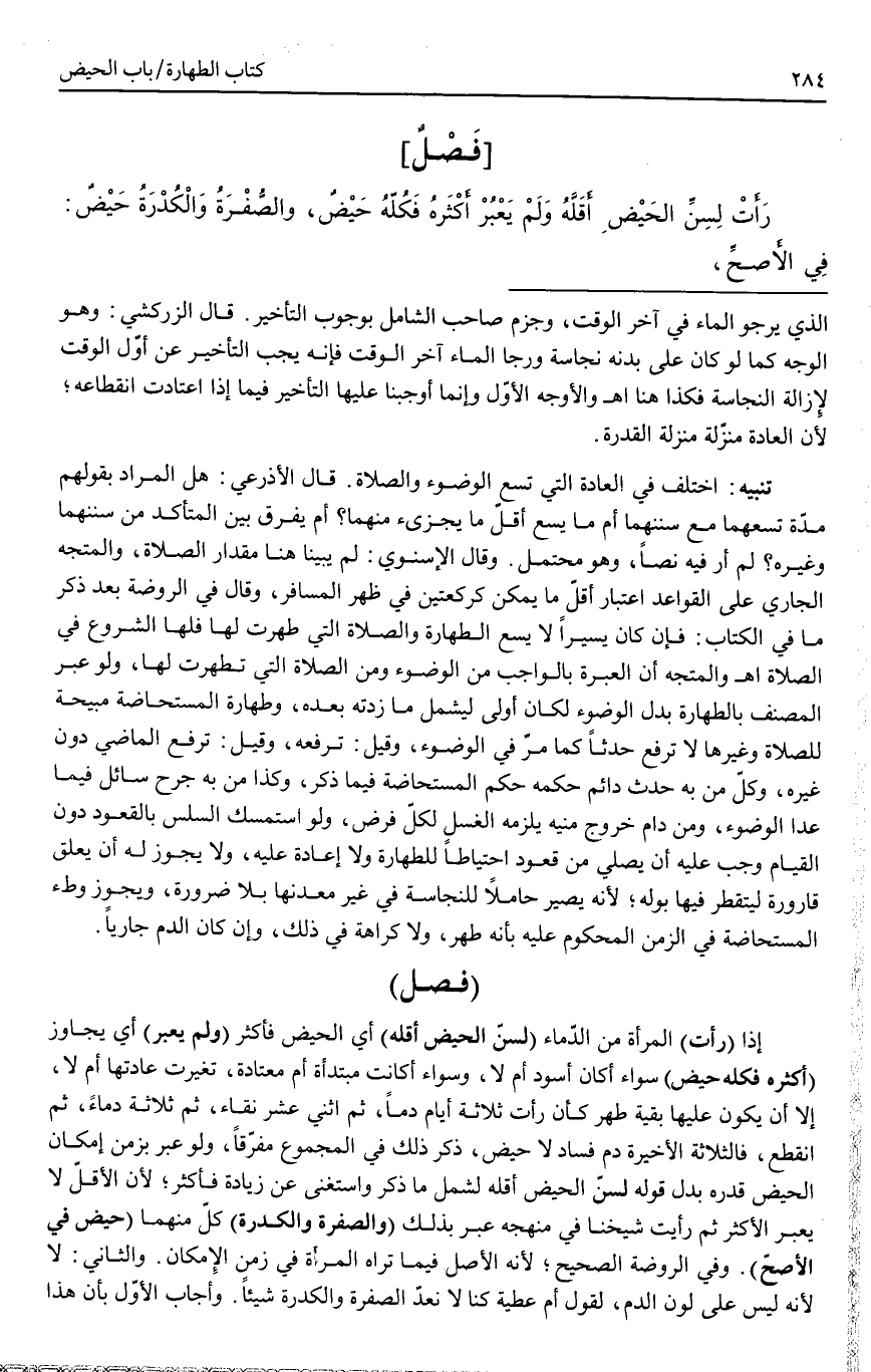 (فَصْلٌ) إذَا (رَأَتْ) الْمَرْأَةُ مِنْ الدِّمَاءِ (لِسِنِّ الْحَيْضِ أَقَلَّهُ) أَيْ الْحَيْضِ فَأَكْثَرَ (وَلَمْ يَعْبُرْ) أَيْ يُجَاوِزْ (أَكْثَرَهُ فَكُلُّهُ حَيْضٌ) سَوَاءٌ أَكَانَ أَسْوَدَ أَمْ لَا، وَسَوَاءٌ أَكَانَتْ مُبْتَدَأَةً أَمْ مُعْتَادَةً، تَغَيَّرَتْ عَادَتُهَا أَمْ لَا، إلَّا أَنْ يَكُونَ عَلَيْهَا بَقِيَّةُ طُهْرٍ كَأَنْ رَأَتْ ثَلَاثَةَ أَيَّامٍ دَمًا، ثُمَّ اثْنَيْ عَشَرَ نَقَاءً، ثُمَّ ثَلَاثَةً دِمَاءً، ثُمَّ انْقَطَعَ، فَالثَّلَاثَةُ الْأَخِيرَةُ دَمُ فَسَادٍ لَا حَيْضٍ، ذَكَرَ ذَلِكَ فِي الْمَجْمُوعِ مُفَرَّقًا، وَلَوْ عَبَّرَ بِزَمَنِ إمْكَانِ الْحَيْضِ قَدْرَهُ بَدَلَ قَوْلِهِ لِسِنِّ الْحَيْضِ أَقَلَّهُ لَشَمَلَ مَا ذَكَرَ وَاسْتَغْنَى عَنْ زِيَادَةٍ فَأَكْثَرَ؛ لِأَنَّ الْأَقَلَّ لَا يَعْبُرُ الْأَكْثَرَ ثُمَّ رَأَيْتُ شَيْخُنَا فِي مَنْهَجِهِ عَبَّرَ بِذَلِكَ.