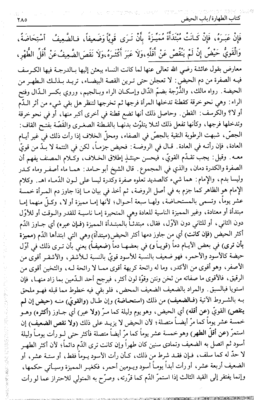 وَالْمُرَادُ بِالضَّعِيفِ الضَّعِيفُ الْمَحْضُ، فَلَوْ بَقِيَ فِيهِ خُطُوطٌ مِمَّا قَبْلَهُ فَهُوَ مُلْحَقٌ بِهِ بِالشُّرُوطِ الْآتِيَةِ (فَالضَّعِيفُ) مِنْ ذَلِكَ (اسْتِحَاضَةٌ) وَإِنْ طَالَ (وَالْقَوِيُّ) مِنْهُ (حَيْضٌ إنْ لَمْ يَنْقُصْ) الْقَوِيُّ (عَنْ أَقَلِّهِ) أَيْ الْحَيْضِ، وَهُوَ يَوْمٌ وَلَيْلَةٌ كَمَا مَرَّ (وَلَا عَبَرَ) أَيْ جَاوَزَ (أَكْثَرَهُ) وَهُوَ خَمْسَةَ عَشَرَ يَوْمًا كَمَا مَرَّ أَيْضًا مُتَّصِلَةً؛ لِأَنَّ الْحَيْضَ لَا يَزِيدُ عَلَى ذَلِكَ (وَلَا نَقَصَ الضَّعِيفُ) إنْ اسْتَمَرَّ (عَنْ أَقَلِّ الطُّهْرِ) وَهُوَ خَمْسَةَ عَشَرَ يَوْمًا كَمَا مَرَّ أَيْضًا مُتَّصِلَةً فَأَكْثَرُ حَتَّى لَوْ رَأَتْ يَوْمًا وَلَيْلَةً أَسْوَدَ ثُمَّ اتَّصَلَ بِهِ الضَّعِيفُ وَتَمَادَى سِنِينَ كَانَ طُهْرًا وَإِنْ كَانَتْ تَرَى الدَّمَ دَائِمًا؛ لِأَنَّ أَكْثَرَ الطُّهْرِ لَا حَدَّ لَهُ كَمَا سَلَفَ، فَإِنْ فُقِدَ شَرْطٌ مِنْ ذَلِكَ، كَأَنْ رَأَتْ الْأَسْوَدَ يَوْمًا فَقَطْ، أَوْ سِتَّةَ عَشَرَ، أَوْ الضَّعِيفَ أَرْبَعَةَ عَشَرَ، أَوْ رَأَتْ أَبَدًا يَوْمًا أَسْوَدَ وَيَوْمَيْنِ أَحْمَرَ، فَكَغَيْرِ الْمُمَيِّزَةِ وَسَيَأْتِي حُكْمُهَا، وَإِنَّمَا يَفْتَقِرُ إلَى الْقَيْدِ الثَّالِثِ إذَا اسْتَمَرَّ الدَّمُ كَمَا قَرَّرْتُهُ، وَصَرَّحَ بِهِ الْمُتَوَلِّي لِلِاحْتِرَازِ عَمَّا لَوْ رَأَتْ