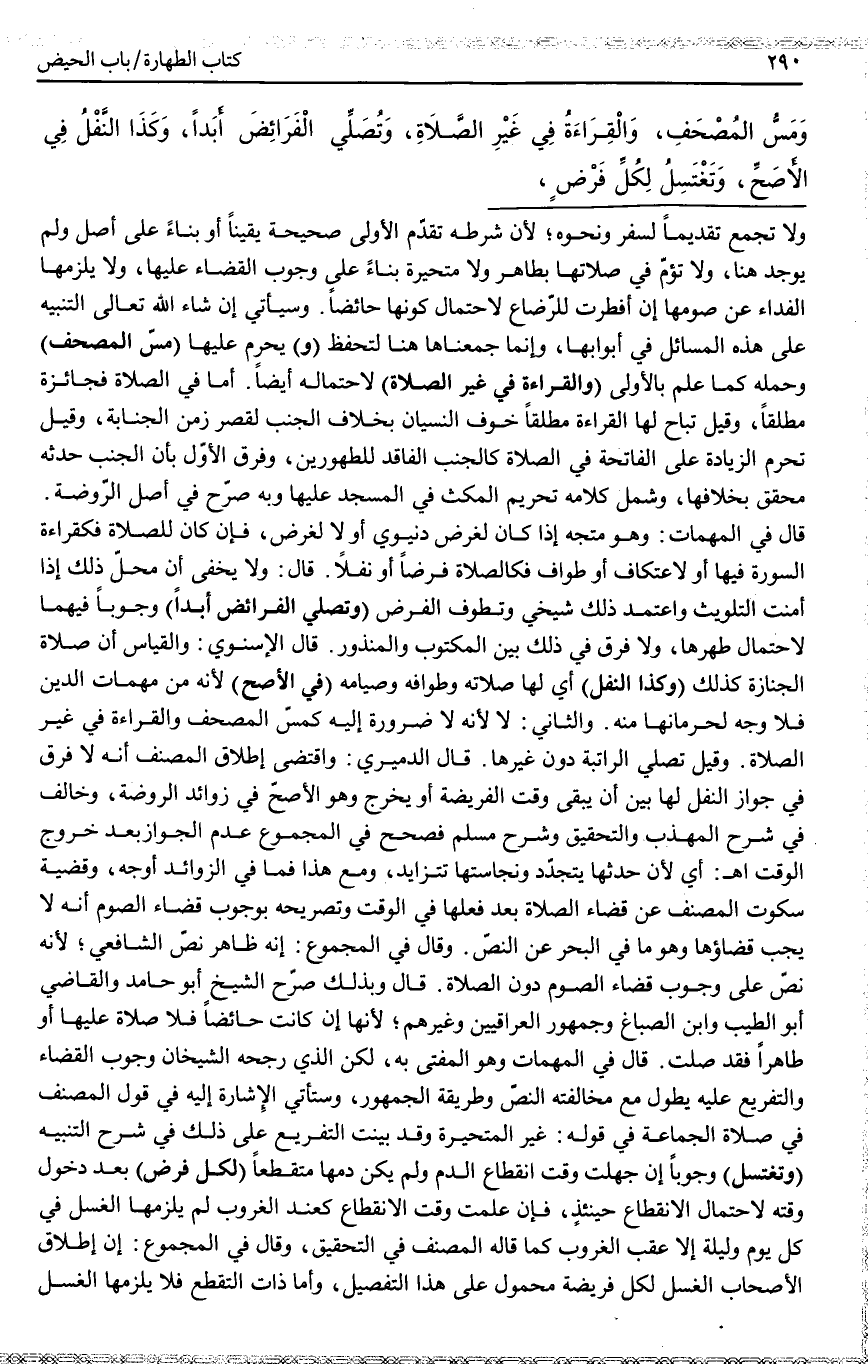 وَمَسُّ الْمُصْحَفِ، وَالْقِرَاءَةُ فِي غَيْرِ الصَّلَاةِ، وَتُصَلِّي الْفَرَائِضَ أَبَدًا، وَكَذَا النَّفَلُ فِي الْأَصَحِّ، وَتَغْتَسِلُ لِكُلِّ فَرْضٍ،