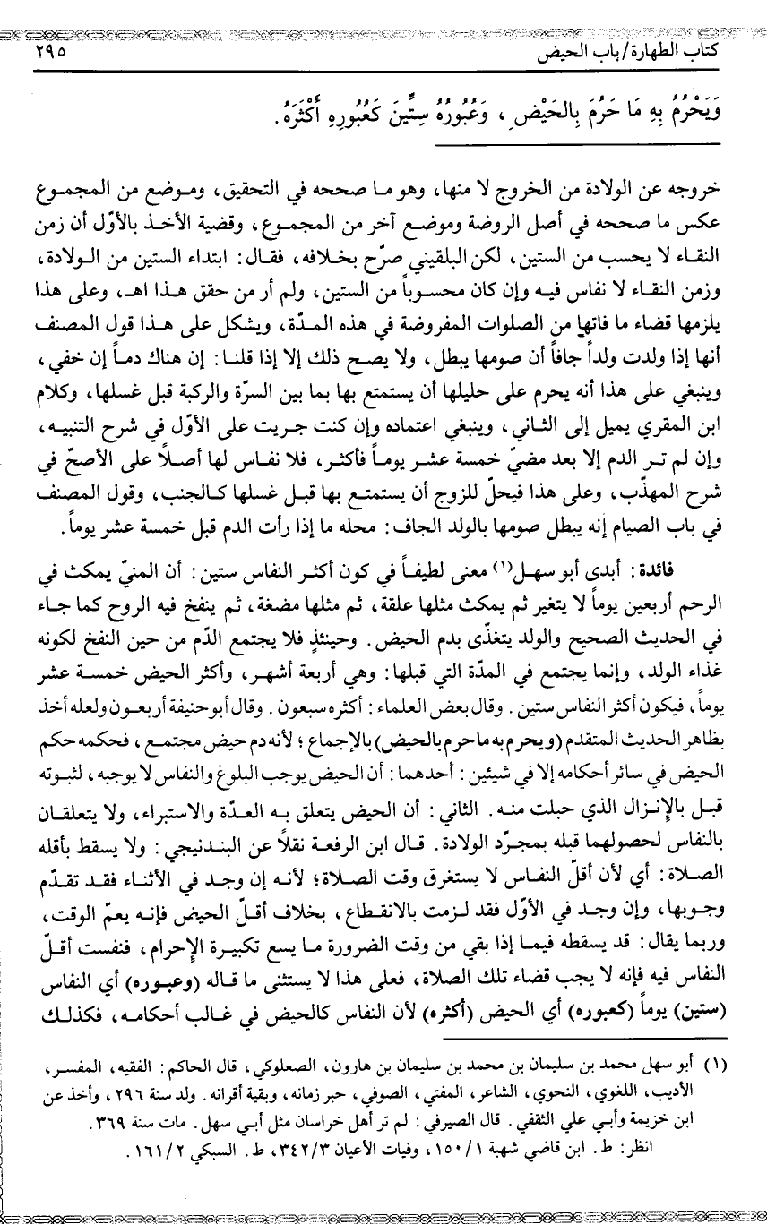 فَائِدَةٌ: أَبْدَى أَبُو سَهْلٍ (1) مَعْنًى لَطِيفًا فِي كَوْنِ أَكْثَرِ النِّفَاسِ سِتِّينَ: أَنَّ الْمَنِيَّ يَمْكُثُ فِي الرَّحِمِ أَرْبَعِينَ يَوْمًا لَا يَتَغَيَّرُ ثُمَّ يَمْكُثُ مِثْلَهَا عَلَقَةً، ثُمَّ مِثْلَهَا مُضْغَةً، ثُمَّ يُنْفَخُ فِيهِ الرُّوحُ كَمَا جَاءَ فِي الْحَدِيثِ الصَّحِيحِ وَالْوَلَدُ يَتَغَذَّى بِدَمِ الْحَيْضِ. وَحِينَئِذٍ فَلَا يَجْتَمِعُ الدَّمُ مِنْ حِينِ النَّفْخِ لِكَوْنِهِ غِذَاءَ الْوَلَدِ، وَإِنَّمَا يَجْتَمِعُ فِي الْمُدَّةِ الَّتِي قَبْلَهَا: وَهِيَ أَرْبَعَةُ أَشْهُرٍ، وَأَكْثَرُ الْحَيْضِ خَمْسَةَ عَشَرَ يَوْمًا، فَيَكُونُ أَكْثَرُ النِّفَاسِ سِتِّينَ.