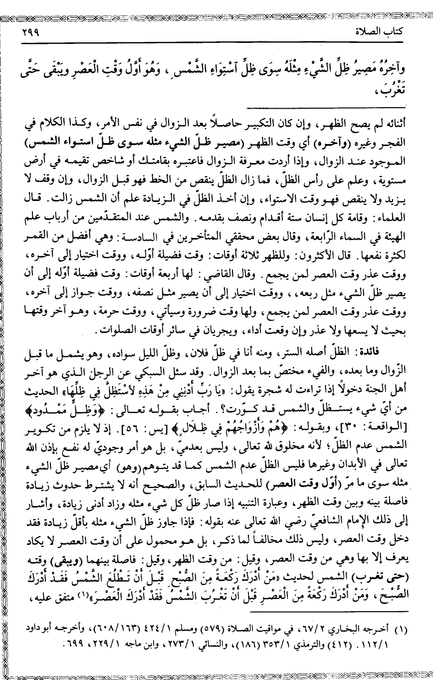 ـــــــــــــــــــــــــــــQأَثْنَائِهِ لَمْ يَصِحَّ الظُّهْرُ، وَإِنْ كَانَ التَّكْبِيرُ حَاصِلَا بَعْدَ الزَّوَالِ فِي نَفْسِ الْأَمْرِ، وَكَذَا الْكَلَامُ فِي الْفَجْرِ وَغَيْرِهِ (وَآخَرُهُ) أَيْ وَقْتِ الظُّهْرِ (مَصِيرُ ظِلِّ الشَّيْءِ مِثْلَهُ سِوَى ظِلِّ اسْتِوَاءِ الشَّمْسِ) الْمَوْجُودِ عِنْدَ الزَّوَالِ، وَإِذَا أَرَدْتَ مَعْرِفَةَ الزَّوَالِ فَاعْتَبِرْهُ بِقَامَتِكَ أَوْ شَاخِصٍ تُقِيمُهُ فِي أَرْضٍ مُسْتَوِيَةٍ، وَعَلِّمْ عَلَى رَأْسِ الظِّلِّ، فَمَا زَالَ الظِّلُّ يَنْقُصُ مِنْ الْخَطِّ فَهُوَ قَبْلَ الزَّوَالِ، وَإِنْ وَقَفَ لَا يَزِيدُ وَلَا يَنْقُصُ فَهُوَ وَقْتُ الِاسْتِوَاءِ، وَإِنْ أَخَذَ الظِّلُّ فِي الزِّيَادَةِ عُلِمَ أَنَّ الشَّمْسَ زَالَتْ. قَالَ الْعُلَمَاءُ: وَقَامَةُ كُلِّ إنْسَانِ سِتَّةُ أَقْدَامٍ وَنِصْفٌ بِقَدَمِهِ. وَالشَّمْسُ عِنْدَ الْمُتَقَدِّمِينَ مِنْ أَرْبَابِ عِلْمِ الْهَيْئَةِ فِي السَّمَاءِ الرَّابِعَةِ.