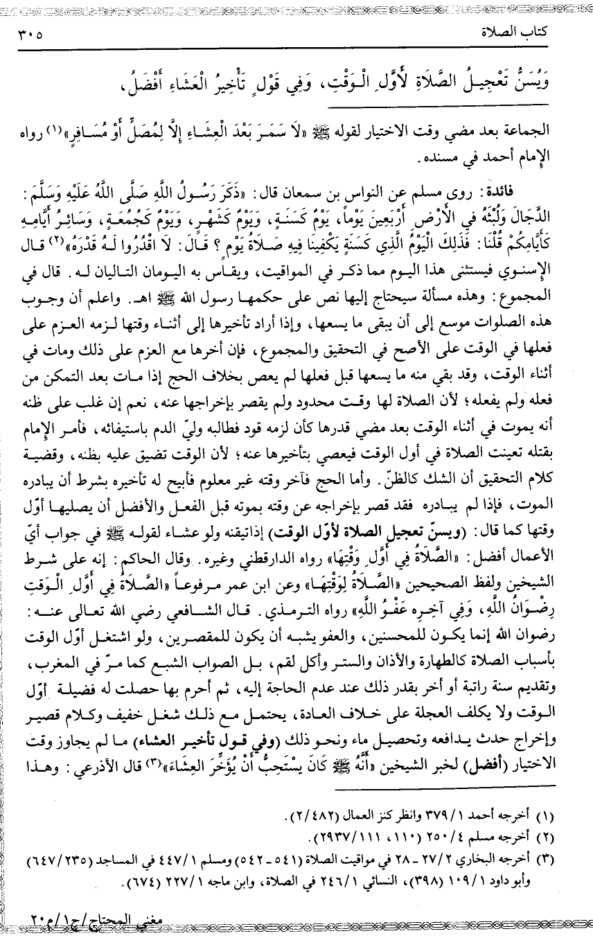 وَأَمَّا الْحَجُّ فَآخِرُ وَقْتِهِ غَيْرُ مَعْلُومٍ فَأُبِيحَ لَهُ تَأْخِيرُهُ بِشَرْطِ أَنْ يُبَادِرَهُ الْمَوْتُ، فَإِذَا لَمْ يُبَادِرْهُ فَقَدْ قَصَّرَ بِإِخْرَاجِهِ عَنْ وَقْتِهِ بِمَوْتِهِ قَبْلَ الْفِعْلِ وَالْأَفْضَلُ أَنْ يُصَلِّيَهَا أَوَّلَ وَقْتِهَا كَمَا قَالَ: (وَيُسَنُّ تَعْجِيلُ الصَّلَاةِ لِأَوَّلِ الْوَقْتِ) إذَا تَيَقَّنَهُ وَلَوْ عِشَاءً لِقَوْلِهِ - صَلَّى اللَّهُ عَلَيْهِ وَسَلَّمَ - فِي جَوَابِ أَيُّ الْأَعْمَالِ أَفْضَلُ: «الصَّلَاةُ فِي أَوَّلِ وَقْتِهَا» رَوَاهُ الدَّارَقُطْنِيّ وَغَيْرُهُ.