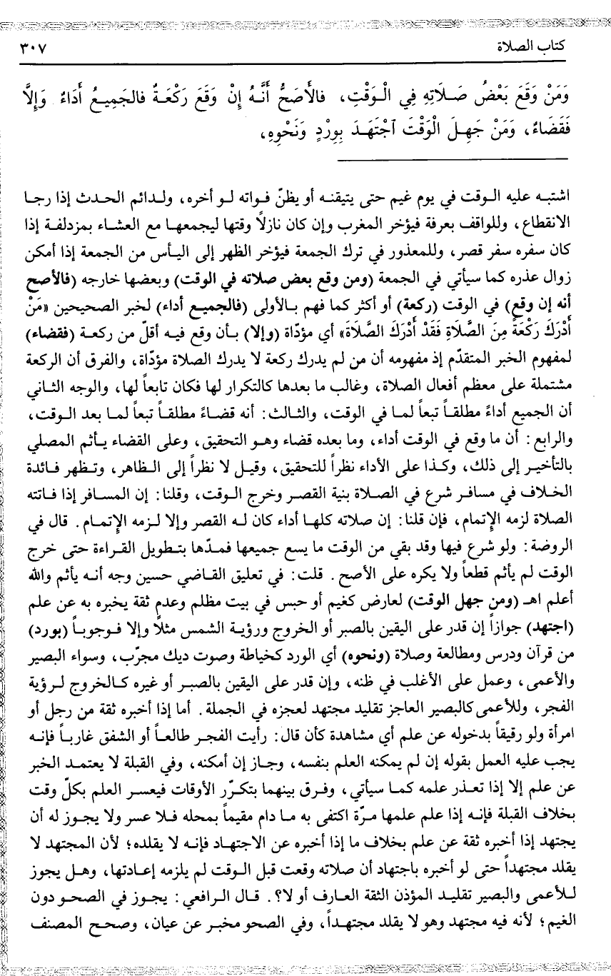(وَمَنْ جَهِلَ الْوَقْتَ) لِعَارِضٍ كَغَيْمٍ أَوْ حَبْسٍ فِي بَيْتٍ مُظْلِمٍ وَعَدِمَ ثِقَةٍ يُخْبِرُهُ بِهِ عَنْ عِلْمٍ (اجْتَهَدَ) جَوَازًا إنْ قَدَرَ عَلَى الْيَقِينِ بِالصَّبْرِ أَوْ الْخُرُوجِ وَرُؤْيَةِ الشَّمْسِ مَثَلًا وَإِلَّا فَوُجُوبًا (بِوِرْدٍ) مِنْ قُرْآنٍ وَدَرْسٍ وَمُطَالَعَةٍ وَصَلَاةٍ (وَنَحْوِهِ) أَيْ الْوَرْدِ كَخِيَاطَةٍ وَصَوْتِ دِيكٍ مُجَرَّبٍ، وَسَوَاءٌ الْبَصِيرُ وَالْأَعْمَى، وَعَمِلَ عَلَى الْأَغْلَبِ فِي ظَنِّهِ، وَإِنْ قَدَرَ عَلَى الْيَقِينِ بِالصَّبْرِ أَوْ غَيْرِهِ كَالْخُرُوجِ لِرُؤْيَةِ الْفَجْرِ، وَلِلْأَعْمَى كَالْبَصِيرِ الْعَاجِزِ تَقْلِيدُ مُجْتَهِدٍ لِعَجْزِهِ فِي الْجُمْلَةِ.