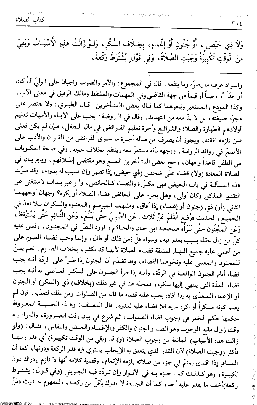 وَفِي صِحَّةِ الْمَكْتُوبَاتِ مِنْ الطِّفْلِ قَاعِدًا وَجْهَانِ، رَجَّحَ بَعْضُ الْمُتَأَخِّرِينَ الْمَنْعَ وَهُوَ مُقْتَضَى إطْلَاقِهِمْ، وَيَجْرِيَانِ فِي الصَّلَاةِ الْمُعَادَةِ (وَلَا) قَضَاءَ عَلَى شَخْصٍ (ذِي حَيْضٍ) إذَا تَطَهَّرَ وَإِنْ تَسَبَّبَ لَهُ بِدَوَاءٍ، وَقَدْ مَرَّتْ هَذِهِ الْمَسْأَلَةُ فِي بَابِ الْحَيْضِ فَهِيَ مُكَرَّرَةٌ وَالنُّفَسَاءُ كَالْحَائِضِ، وَلَوْ عَبَّرَ بِذَاتٍ لَاسْتَغْنَى عَنْ التَّقْدِيرِ الْمَذْكُورِ، وَكَانَ أَوْلَى، وَهَلْ يَحْرُمُ عَلَى الْحَائِضِ قَضَاءُ الصَّلَاةِ أَوْ يُكْرَهُ؟ وَجْهَانِ أَوْجَهُهُمَا الثَّانِي (أَوْ) ذِي (جُنُونٍ أَوْ إغْمَاءٍ) إذَا أَفَاقَ، وَمِثْلُهُمَا الْمُبَرْسَمُ وَالْمَعْتُوهُ وَالسَّكْرَانُ بِلَا تَعَدٍّ فِي الْجَمِيعِ، لِحَدِيثِ «رُفِعَ الْقَلَمُ عَنْ ثَلَاثٍ: عَنْ الصَّبِيِّ حَتَّى يَبْلُغَ، وَعَنْ النَّائِمِ حَتَّى يَسْتَيْقِظَ، وَعَنْ الْمَجْنُونِ حَتَّى يَبْرَأَ» صَحَّحَهُ ابْنُ حِبَّانَ وَالْحَاكِمُ.