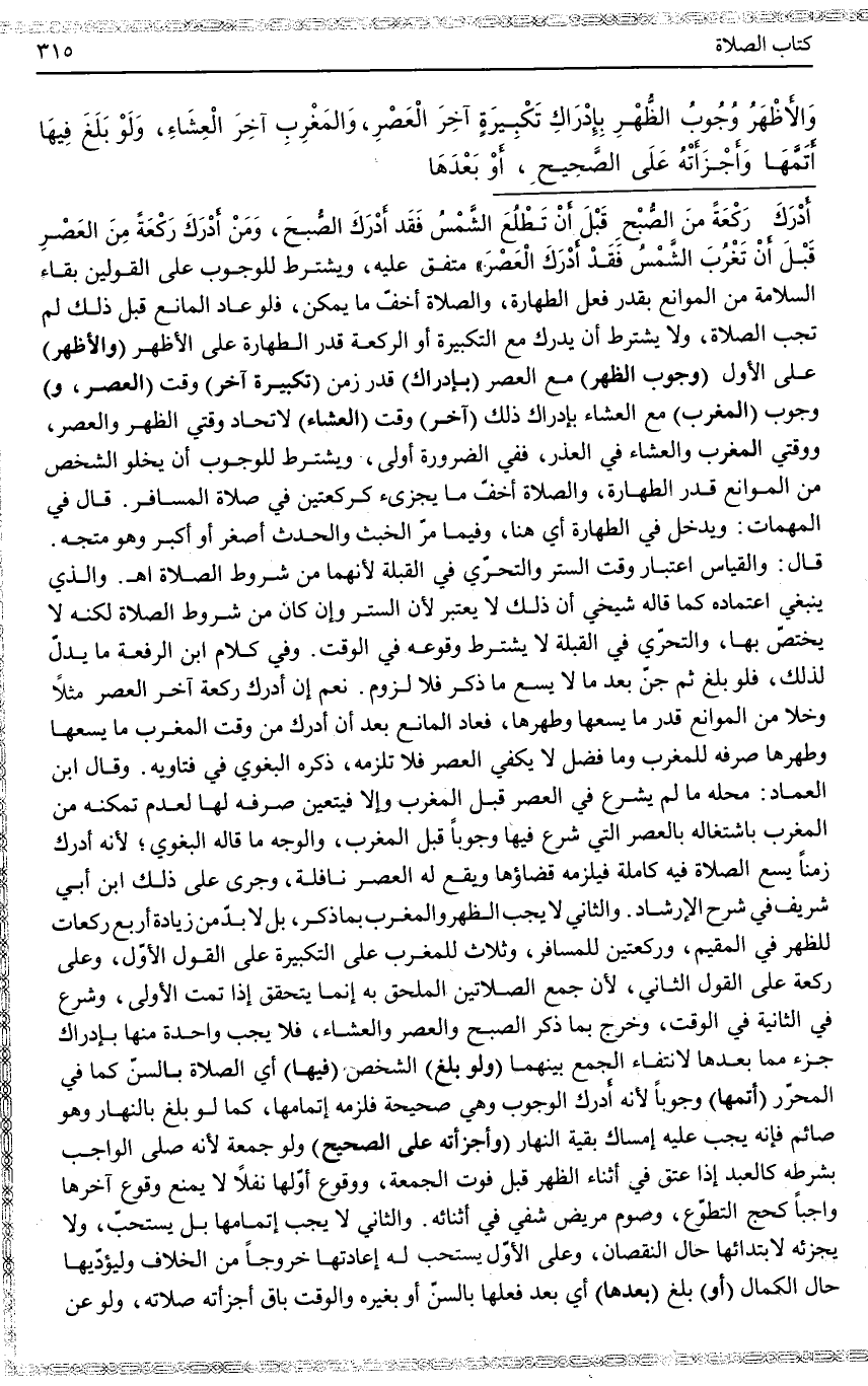 ـــــــــــــــــــــــــــــQ «مَنْ أَدْرَكَ رَكْعَةً مِنْ الصُّبْحِ قَبْلَ أَنْ تَطْلُعَ الشَّمْسُ فَقَدْ أَدْرَكَ الصُّبْحَ، وَمَنْ أَدْرَكَ رَكْعَةً مِنْ الْعَصْرِ قَبْلَ أَنْ تَغْرُبَ الشَّمْسُ فَقَدْ أَدْرَكَ الْعَصْرَ» مُتَّفِقٌ عَلَيْهِ، وَيُشْتَرَطُ لِلْوُجُوبِ عَلَى الْقَوْلَيْنِ بَقَاءُ السَّلَامَةِ مِنْ الْمَوَانِعِ بِقَدْرِ فِعْلِ الطَّهَارَةِ، وَالصَّلَاةُ أَخَفُّ مَا يُمْكِنُ، فَلَوْ عَادَ الْمَانِعُ قَبْلَ ذَلِكَ لَمْ تَجِبْ الصَّلَاةُ، وَلَا يُشْتَرَطُ أَنْ يُدْرِكَ مَعَ التَّكْبِيرَةِ أَوْ الرَّكْعَةِ قَدْرَ الطَّهَارَةِ عَلَى الْأَظْهَرِ (وَالْأَظْهَرُ) عَلَى الْأَوَّلِ (وُجُوبُ الظُّهْرِ) مَعَ الْعَصْرِ (بِإِدْرَاكِ) قَدْرِ زَمَنِ (تَكْبِيرَةٍ آخِرَ) وَقْتِ (الْعَصْرِ، وَ) وُجُوبُ (الْمَغْرِبِ) مَعَ الْعِشَاءِ بِإِدْرَاكِ ذَلِكَ (آخِرَ) وَقْتِ (الْعِشَاءِ) لِاتِّحَادِ وَقْتَيْ الظُّهْرِ وَالْعَصْرِ، وَوَقْتَيْ الْمَغْرِبِ وَالْعِشَاءِ فِي الْعُذْرِ، فَفِي الضَّرُورَةِ أَوْلَى، وَيُشْتَرَطُ لِلْوُجُوبِ أَنْ يَخْلُوَ الشَّخْصُ مِنْ الْمَوَانِعِ قَدْرَ الطَّهَارَةِ، وَالصَّلَاةُ أَخَفُّ مَا يُجْزِئُ كَرَكْعَتَيْنِ فِي صَلَاةِ الْمُسَافِرِ.