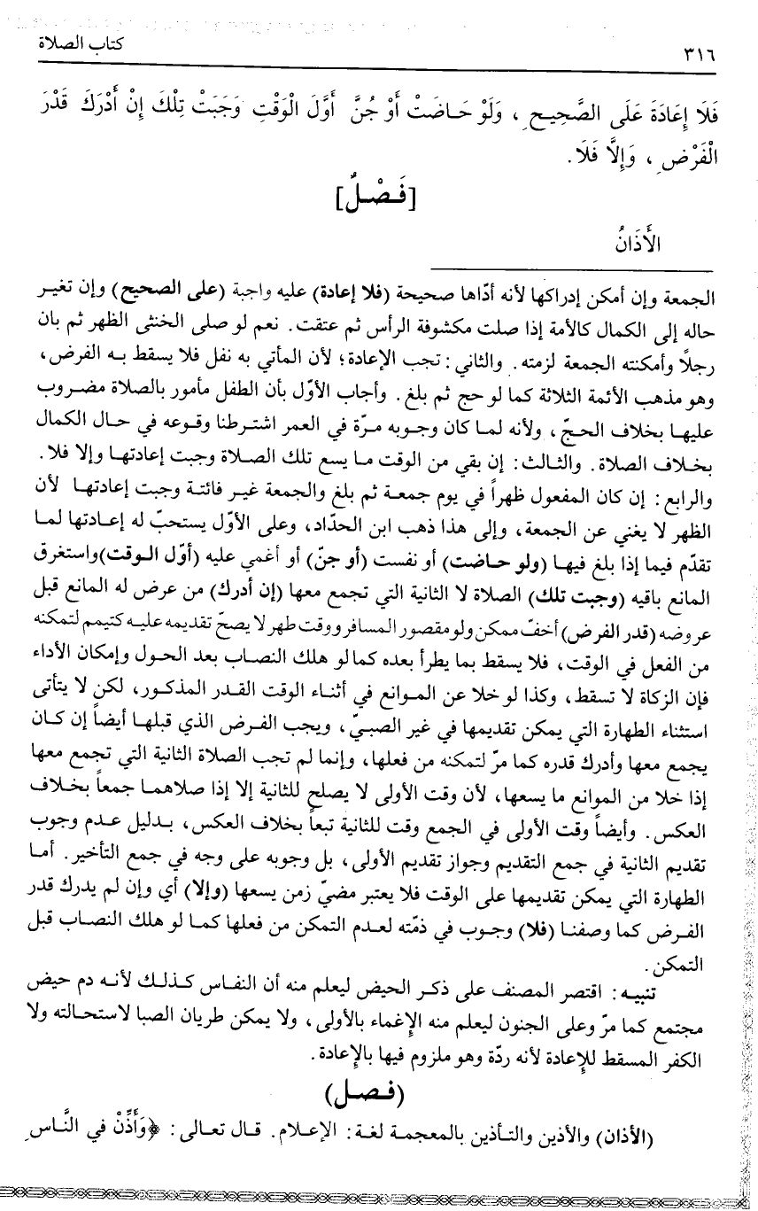 (فَصْلٌ) (الْأَذَانُ) وَالْأَذِينُ وَالتَّأْذِينُ بِالْمُعْجَمَةِ لُغَةً: الْإِعْلَامُ، قَالَ تَعَالَى: {وَأَذِّنْ فِي النَّاسِ بِالْحَجِّ} [الحج: 27]
