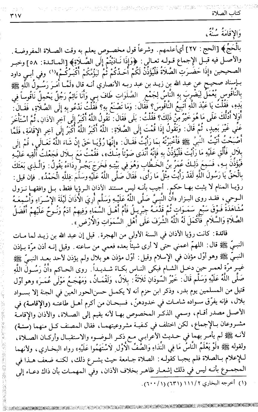 وَالْأَصْلُ فِيهِ قَبْلَ الْإِجْمَاعِ قَوْله تَعَالَى: {وَإِذَا نَادَيْتُمْ إِلَى الصَّلاةِ} [المائدة: 58] [الْمَائِدَةُ] وَخَبَرُ الصَّحِيحَيْنِ «إذَا حَضَرَتْ الصَّلَاةُ فَلْيُؤَذِّنْ لَكُمْ أَحَدُكُمْ ثُمَّ لِيَؤُمَّكُمْ أَكْبَرُكُمْ» (1) وَفِي أَبِي دَاوُد بِإِسْنَادٍ صَحِيحٍ عَنْ عَبْدِ اللَّهِ بْنِ زَيْدِ بْنِ عَبْدِ رَبِّهِ الْأَنْصَارِيِّ أَنَّهُ قَالَ «لَمَّا أَمَرَ رَسُولُ اللَّهِ - صَلَّى اللَّهُ عَلَيْهِ وَسَلَّمَ - بِالنَّاقُوسِ يُعْمَلُ لِيُضْرَبَ بِهِ النَّاسُ لِجَمْعِ الصَّلَوَاتِ طَافَ بِي وَأَنَا نَائِمٌ رَجُلٌ يَحْمِلُ نَاقُوسًا فِي يَدِهِ، فَقُلْتُ يَا عَبْدَ اللَّهِ أَتَبِيعُ النَّاقُوسَ؟ فَقَالَ: وَمَا تَصْنَعُ بِهِ؟ فَقُلْتُ نَدْعُو بِهِ إلَى الصَّلَاةِ، فَقَالَ: أَوَلَا أَدُلُّكَ عَلَى مَا هُوَ خَيْرٌ مِنْ ذَلِكَ؟ فَقُلْتُ: بَلَى فَقَالَ: تَقُولُ اللَّهُ أَكْبَرُ إلَى آخِرِ الْأَذَانِ، ثُمَّ أَسْتَأْخَرَ عَنِّي غَيْرَ بَعِيدٍ، ثُمَّ قَالَ: وَتَقُولُ إذَا قُمْتَ إلَى الصَّلَاةِ: اللَّهُ أَكْبَرُ اللَّهُ أَكْبَرُ إلَى آخِرِ الْإِقَامَةِ، فَلَمَّا أَصْبَحْتُ أَتَيْت النَّبِيَّ - صَلَّى اللَّهُ عَلَيْهِ وَسَلَّمَ - فَأَخْبَرْتُهُ بِمَا رَأَيْتُ فَقَالَ: إنَّهَا رُؤْيَا حَقٍّ إنْ شَاءَ اللَّهُ تَعَالَى، قُمْ إلَى بِلَالٍ فَأَلْقِ عَلَيْهِ مَا رَأَيْتَ فَلْيُؤَذِّنْ بِهِ فَإِنَّهُ أَنْدَى صَوْتًا مِنْكَ، فَقُمْتُ مَعَ بِلَالٍ فَجَعَلْتُ أُلْقِيهِ عَلَيْهِ فَيُؤَذِّنُ بِهِ، فَسَمِعَ ذَلِكَ عُمَرُ بْنُ الْخَطَّابِ وَهُوَ فِي بَيْتِهِ فَخَرَجَ يَجُرُّ رِدَاءَهُ يَقُولُ: وَاَلَّذِي بَعَثَكَ بِالْحَقِّ يَا رَسُولَ اللَّهِ لَقَدْ رَأَيْتُ مِثْلَ مَا رَأَى، فَقَالَ - صَلَّى اللَّهُ عَلَيْهِ وَسَلَّمَ -: فَلِلَّهِ الْحَمْدُ» .