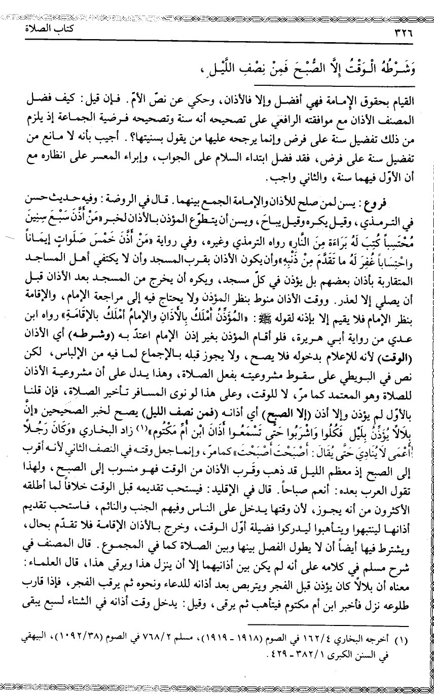 (وَشَرْطُهُ) أَيْ الْأَذَانِ (الْوَقْتُ) ؛ لِأَنَّهُ لِلْإِعْلَامِ بِدُخُولِهِ فَلَا يَصِحُّ، وَلَا يَجُوزُ قَبْلَهُ بِالْإِجْمَاعِ لِمَا فِيهِ مِنْ الْإِلْبَاسِ، لَكِنْ نَصَّ فِي الْبُوَيْطِيِّ عَلَى سُقُوطِ مَشْرُوعِيَّتِهِ بِفِعْلِ الصَّلَاةِ، وَهَذَا يَدُلُّ عَلَى أَنَّ مَشْرُوعِيَّةَ الْأَذَانِ لِلصَّلَاةِ وَهُوَ الْمُعْتَمَدُ كَمَا مَرَّ، لَا لِلْوَقْتِ، وَعَلَى هَذَا لَوْ نَوَى الْمُسَافِرُ تَأْخِيرَ الصَّلَاةِ، فَإِنْ قُلْنَا بِالْأَوَّلِ لَمْ يُؤَذِّنْ وَإِلَّا أَذَّنَ (إلَّا الصُّبْحَ) أَيْ أَذَانَهُ (فَمِنْ نِصْفِ اللَّيْلِ) يَصِحُّ لِخَبَرِ الصَّحِيحَيْنِ «إنَّ بِلَالًا يُؤَذِّنُ بِلَيْلٍ فَكُلُوا وَاشْرَبُوا حَتَّى تَسْمَعُوا أَذَانَ ابْنِ أُمِّ مَكْتُومٍ» (1) زَادَ الْبُخَارِيُّ «وَكَانَ رَجُلًا أَعْمَى لَا يُنَادِي حَتَّى يُقَالَ لَهُ أَصْبَحْتَ أَصْبَحْتَ» كَمَا مَرَّ، وَإِنَّمَا جُعِلَ وَقْتُهُ فِي النِّصْفِ الثَّانِي؛ لِأَنَّهُ أَقْرَبُ إلَى الصُّبْحِ إذْ مُعْظَمُ اللَّيْلِ قَدْ ذَهَبَ وَقَرُبَ الْأَذَانُ مِنْ الْوَقْتِ فَهُوَ مَنْسُوبٌ إلَى الصُّبْحِ، وَلِهَذَا تَقُولُ الْعَرَبُ بَعْدَهُ: أَنْعِمْ صَبَاحًا.