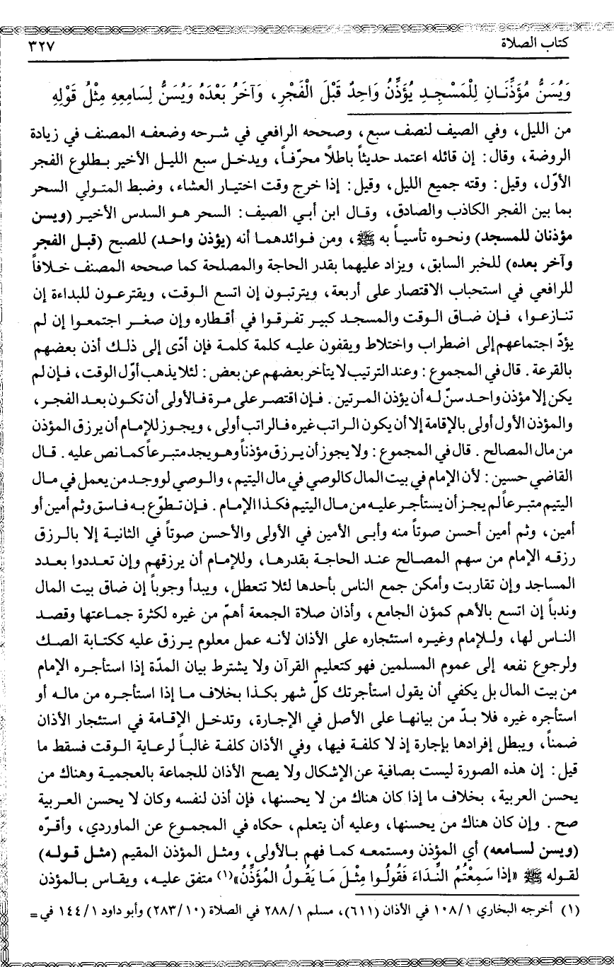 وَيُسَنُّ مُؤَذِّنَانِ لِلْمَسْجِدِ يُؤَذِّنُ وَاحِدٌ قَبْلَ الْفَجْرِ، وَآخَرُ بَعْدَهُ