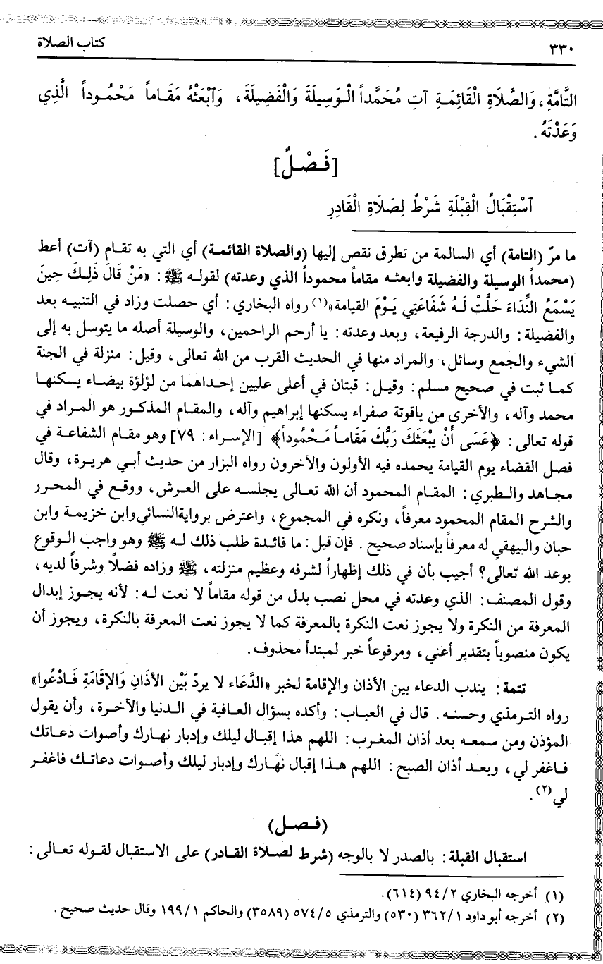 ـــــــــــــــــــــــــــــQمَا مَرَّ (التَّامَّةِ) أَيْ السَّالِمَةِ مِنْ تَطَرُّقِ نَقْصٍ إلَيْهَا (وَالصَّلَاةِ الْقَائِمَةِ) أَيْ الَّتِي بِهِ تُقَامُ (آتِ) أَعْطِ (مُحَمَّدًا الْوَسِيلَةَ وَالْفَضِيلَةَ وَابْعَثْهُ مَقَامًا مَحْمُودًا الَّذِي وَعَدْتَهُ) لِقَوْلِهِ - صَلَّى اللَّهُ عَلَيْهِ وَسَلَّمَ -: «مَنْ قَالَ ذَلِكَ حِينَ يَسْمَعُ النِّدَاءَ حَلَّتْ لَهُ شَفَاعَتِي يَوْمَ الْقِيَامَةِ» (1) رَوَاهُ الْبُخَارِيُّ: أَيْ حَصَلَتْ وَزَادَ فِي التَّنْبِيهِ بَعْدَ وَالْفَضِيلَةَ: وَالدَّرَجَةَ الرَّفِيعَةَ، وَبَعْدَ وَعَدْتَهُ: يَا أَرْحَمَ الرَّاحِمِينَ، وَالْوَسِيلَةُ أَصْلُ مَا يُتَوَسَّلُ بِهِ إلَى الشَّيْء، وَالْجَمْعُ وَسَائِلُ، وَالْمُرَادُ مِنْهَا فِي الْحَدِيثِ الْقُرْبُ مِنْ اللَّهِ تَعَالَى، وَقِيلَ: مَنْزِلَةٌ فِي الْجَنَّةِ كَمَا ثَبَتَ فِي صَحِيحِ مُسْلِمٍ: وَقِيلَ: قُبَّتَانِ فِي أَعْلَى عِلِّيِّينَ إحْدَاهُمَا مِنْ لُؤْلُؤَةٍ بَيْضَاءَ يَسْكُنُهَا مُحَمَّدٌ وَآلُهُ، وَالْأُخْرَى مِنْ يَاقُوتَةٍ صَفْرَاءَ يَسْكُنُهَا إبْرَاهِيمُ وَآلُهُ، وَالْمَقَامُ الْمَذْكُورُ هُوَ الْمُرَادُ فِي قَوْله تَعَالَى: {عَسَى أَنْ يَبْعَثَكَ رَبُّكَ مَقَامًا مَحْمُودًا} [الإسراء: 79] [الْإِسْرَاءُ] وَهُوَ مَقَامُ الشَّفَاعَةِ فِي فَصْلِ الْقَضَاءِ يَوْمَ الْقِيَامَةِ يَحْمَدُهُ فِيهِ الْأَوَّلُونَ وَالْآخِرُونَ رَوَاهُ الْبَزَّارُ مِنْ حَدِيثِ أَبِي هُرَيْرَةَ.
