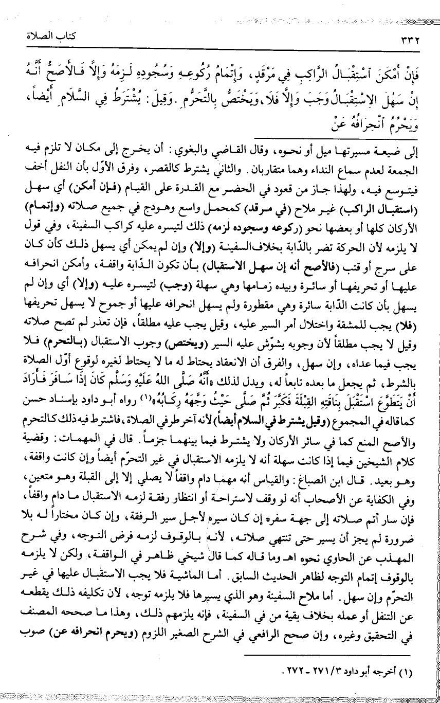 (وَيَخْتَصُّ) وُجُوبُ الِاسْتِقْبَالِ (بِالتَّحَرُّمِ) فَلَا يَجِبُ فِيمَا عَدَاهُ، وَإِنْ سَهُلَ، وَالْفَرْقُ أَنَّ الِانْعِقَادَ يُحْتَاطُ لَهُ مَا لَا يُحْتَاطَ لِغَيْرِهِ لِوُقُوعِ أَوَّلِ الصَّلَاةِ بِالشَّرْطِ، ثُمَّ يَجْعَلُ مَا بَعْدَهُ تَابِعًا لَهُ، وَيَدُلُّ لِذَلِكَ «أَنَّهُ - صَلَّى اللَّهُ عَلَيْهِ وَسَلَّمَ - كَانَ إذَا سَافَرَ فَأَرَادَ أَنْ يَتَطَوَّعَ اسْتَقْبَلَ بِنَاقَتِهِ الْقِبْلَةَ فَكَبَّرَ ثُمَّ صَلَّى حَيْثُ وَجَّهَهُ رِكَابُهُ» (1) رَوَاهُ أَبُو دَاوُد بِإِسْنَادٍ حَسَنٍ كَمَا قَالَهُ فِي الْمَجْمُوعِ (وَقِيلَ يُشْتَرَطُ فِي السَّلَامِ أَيْضًا) ؛ لِأَنَّهُ آخِرُ طَرَفَيْ الصَّلَاةِ، فَاشْتُرِطَ فِيهِ ذَلِكَ كَالتَّحَرُّمِ وَالْأَصَحُّ الْمَنْعُ كَمَا فِي سَائِرِ الْأَرْكَانِ وَلَا يُشْتَرَطُ فِيمَا بَيْنَهُمَا جَزْمًا.