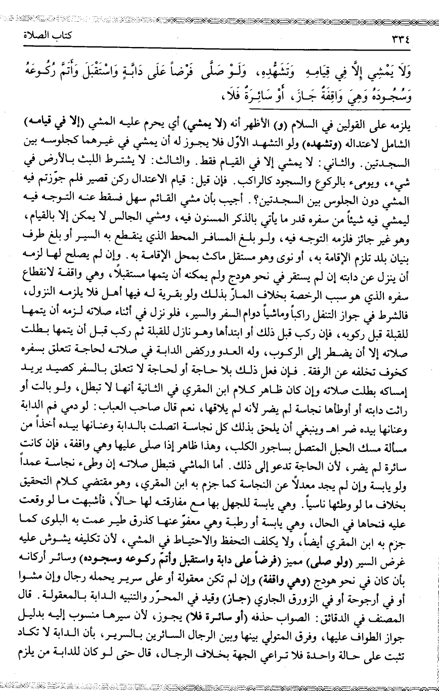 قَالَ الْمُصَنِّفُ فِي الدَّقَائِقِ: الصَّوَابُ حَذْفُهُ (أَوْ سَائِرَةٌ فَلَا) يَجُوزُ؛ لِأَنَّ سَيْرَهَا مَنْسُوبٌ إلَيْهِ بِدَلِيلِ جَوَازِ الطَّوَافِ عَلَيْهَا، وَفَرَّقَ الْمُتَوَلِّي بَيْنَهَا وَبَيْنَ الرِّجَالِ السَّائِرِينَ بِالسَّرِيرِ، بِأَنَّ الدَّابَّةَ لَا تَكَادُ تَثْبُتُ عَلَى حَالَةٍ وَاحِدَةٍ فَلَا تُرَاعِي الْجِهَةَ بِخِلَافِ الرِّجَالِ، قَالَ حَتَّى لَوْ كَانَ لِلدَّابَّةِ مَنْ يَلْزَمُ