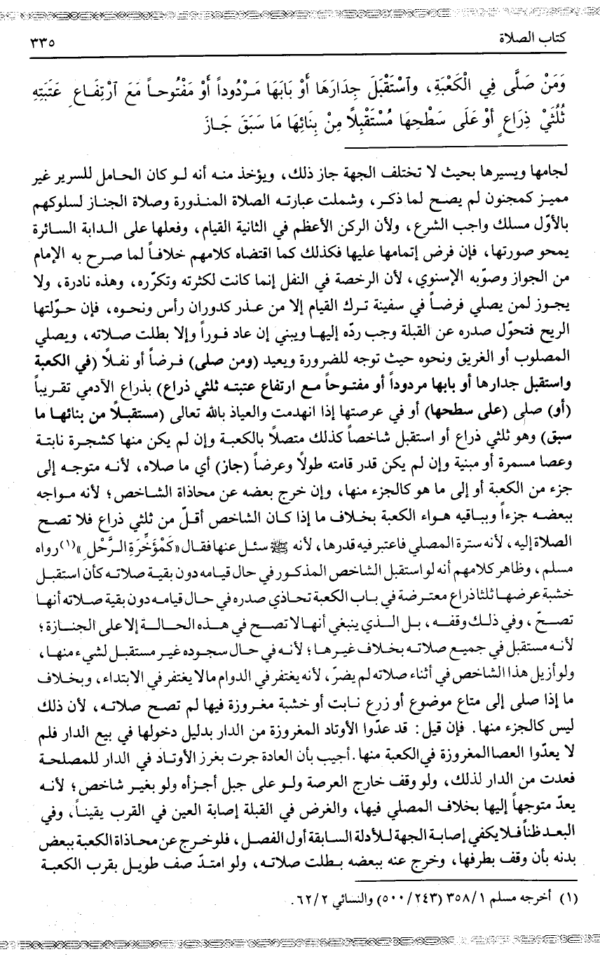 وَمَنْ صَلَّى فِي الْكَعْبَةِ، وَاسْتَقْبَلَ جِدَارَهَا أَوْ بَابَهَا مَرْدُودًا أَوْ مَفْتُوحًا مَعَ ارْتِفَاعِ عَتَبَتِهِ ثُلُثَيْ ذِرَاعٍ أَوْ عَلَى سَطْحِهَا مُسْتَقْبِلًا مِنْ بِنَائِهَا مَا سَبَقَ جَازَ