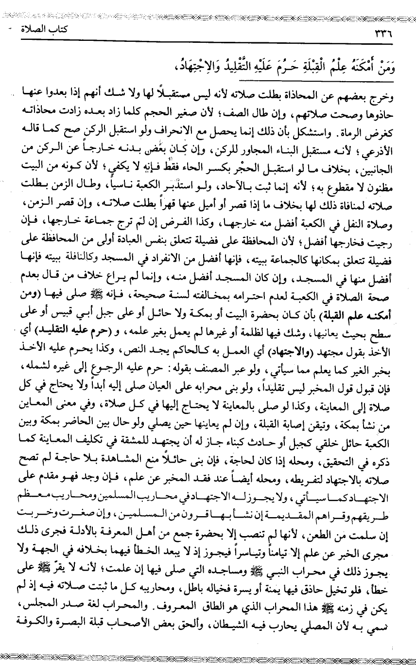 وَمَنْ أَمْكَنَهُ عِلْمُ الْقِبْلَةِ حَرُمَ عَلَيْهِ التَّقْلِيدُ وَالِاجْتِهَادُ.
