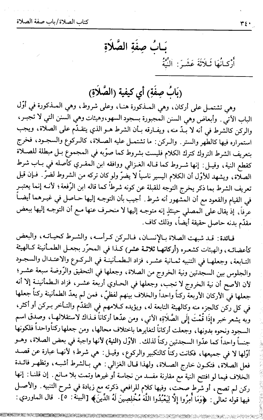 بَابُ صِفَةِ الصَّلَاةِ أَرْكَانُهَا ثَلَاثَةَ عَشَرَ: النِّيَّةُ