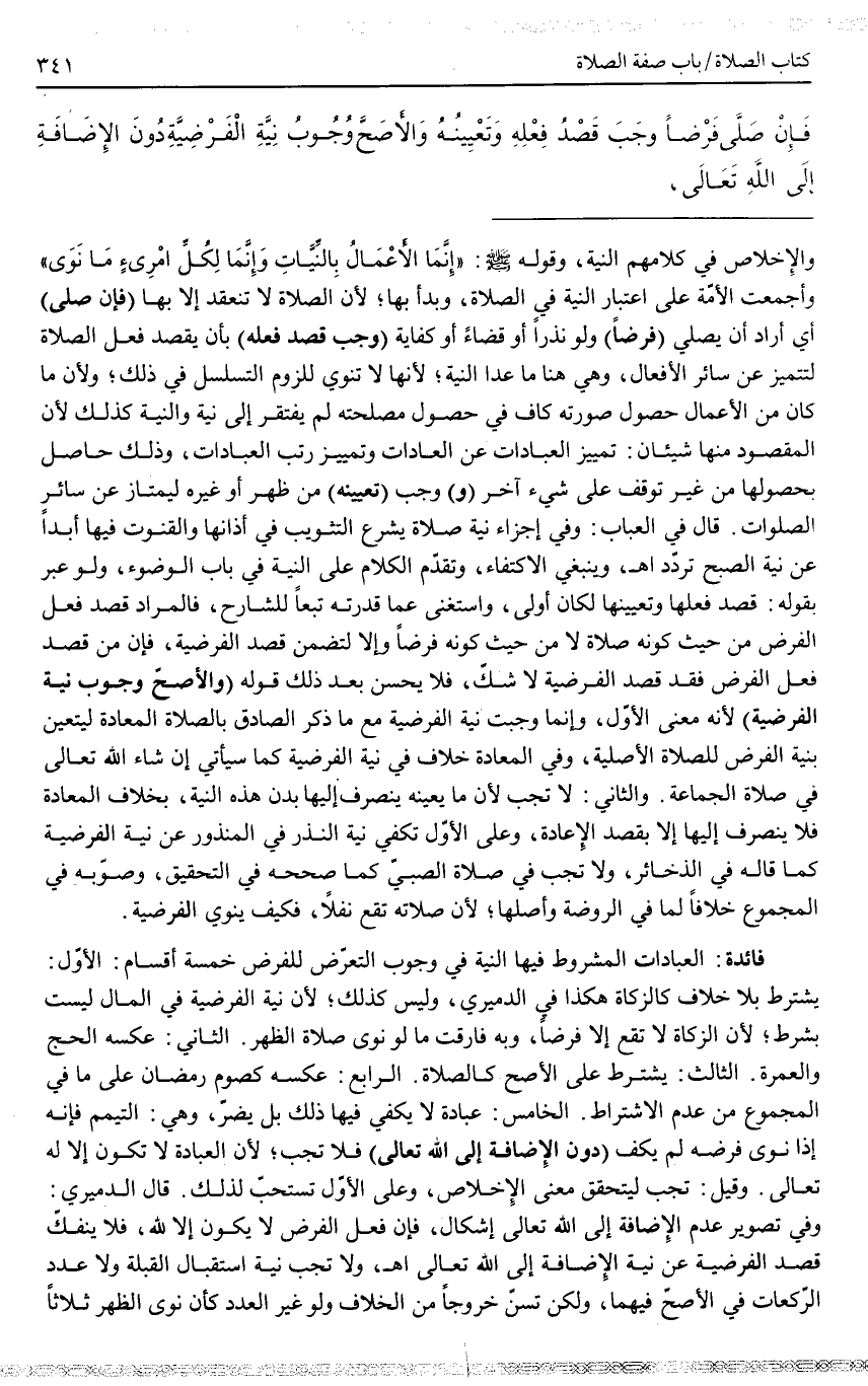 وَيَنْبَغِي الِاكْتِفَاءُ، وَتَقَدَّمَ الْكَلَامُ عَلَى النِّيَّةِ فِي بَابِ الْوُضُوءِ، وَلَوْ عَبَّرَ بِقَوْلِهِ: قَصْدُ فِعْلِهَا وَتَعْيِينِهَا لَكَانَ أَوْلَى، وَاسْتَغْنَى عَمَّا قَدَّرْتُهُ تَبَعًا لِلشَّارِحِ، فَالْمُرَادُ قَصْدُ فِعْلِ الْفَرْضِ مِنْ حَيْثُ كَوْنُهُ صَلَاةً لَا مِنْ حَيْثُ كَوْنُهُ فَرْضًا وَإِلَّا لَتَضَمَّنَ قَصْدَ الْفَرْضِيَّةِ، فَإِنَّ مَنْ قَصَدَ فِعْلَ الْفَرْضِ فَقَدْ قَصَدَ الْفَرْضِيَّةَ لَا شَكَّ، فَلَا يَحْسُنُ بَعْدَ ذَلِكَ.