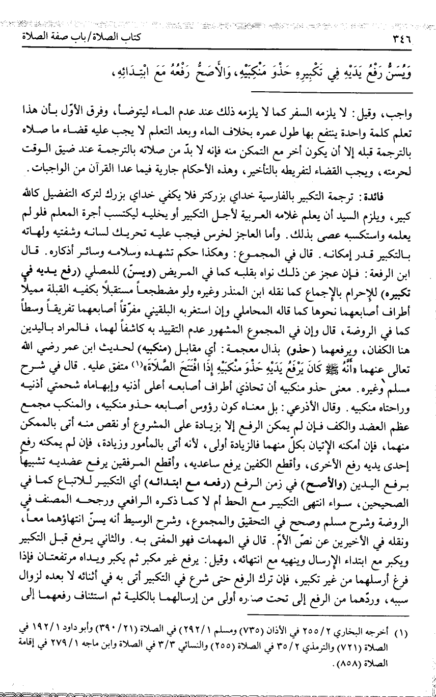 قَالَ فِي شَرْحِ مُسْلِمٍ وَغَيْرِهِ. مَعْنَى حَذْوِ مَنْكِبَيْهِ أَنْ تُحَاذِيَ أَطْرَافُ أَصَابِعِهِ أَعْلَى أُذُنَيْهِ وَإِبْهَامَاهُ شَحْمَتَيْ أُذُنَيْهِ وَرَاحَتَاهُ مَنْكِبَيْهِ، وَقَالَ الْأَذْرَعِيُّ: بَلْ مَعْنَاهُ كَوْنُ رُءُوسِ أَصَابِعِهِ حَذْوَ مَنْكِبَيْهِ، وَالْمَنْكِبُ مَجْمَعُ عَظْمِ الْعَضُدِ وَالْكَفِّ فَإِنْ لَمْ يُمْكِنْ الرَّفْعُ إلَّا بِزِيَادَةٍ عَلَى الْمَشْرُوعِ أَوْ نَقْصٍ مِنْهُ أَتَى بِالْمُمْكِنِ مِنْهُمَا، فَإِنْ أَمْكَنَهُ الْإِتْيَانُ بِكُلٍّ مِنْهُمَا فَالزِّيَادَةُ أَوْلَى؛ لِأَنَّهُ أَتَى بِالْمَأْمُورِ وَزِيَادَةٍ، فَإِنْ لَمْ يُمْكِنْهُ رَفْعُ إحْدَى يَدَيْهِ رَفَعَ الْأُخْرَى، وَأَقْطَعُ الْكَفَّيْنِ يَرْفَعُ سَاعِدَيْهِ، وَأَقْطَعُ الْمِرْفَقَيْنِ يَرْفَعُ عَضُدَيْهِ تَشْبِيهًا بِرَفْعِ الْيَدَيْنِ (وَالْأَصَحُّ) فِي زَمَنِ الرَّفْعِ (رَفْعُهُ مَعَ ابْتِدَائِهِ) أَيْ التَّكْبِيرِ لِلِاتِّبَاعِ كَمَا فِي الصَّحِيحَيْنِ، سَوَاءٌ انْتَهَى التَّكْبِيرُ مَعَ الْحَطِّ أَمْ لَا كَمَا ذَكَرَهُ الرَّافِعِيُّ وَرَجَّحَهُ الْمُصَنِّفُ فِي الرَّوْضَةِ وَشَرْحِ مُسْلِمٍ وَصَحَّحَ فِي التَّحْقِيقِ وَالْمَجْمُوعِ، وَشَرْحِ الْوَسِيطِ أَنَّهُ يُسَنُّ انْتِهَاؤُهُمَا مَعًا، وَنَقَلَهُ فِي الْأَخِيرَيْنِ عَنْ نَصِّ الْأُمِّ.