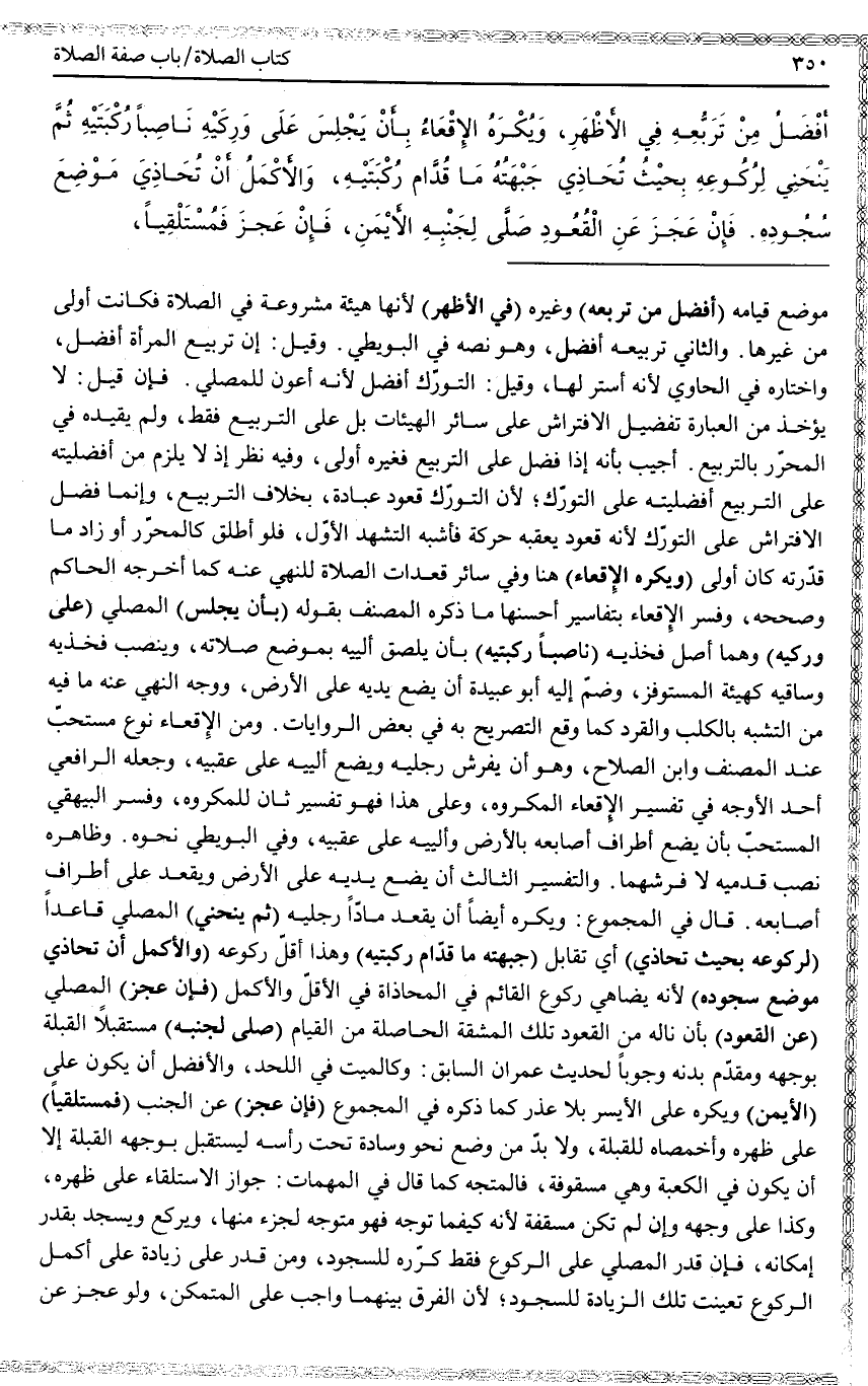 وَيُكْرَهُ الْإِقْعَاءُ بِأَنْ يَجْلِسَ عَلَى وَرِكَيْهِ نَاصِبًا رُكْبَتَيْهِ ثُمَّ يَنْحَنِي لِرُكُوعِهِ بِحَيْثُ تُحَاذِي جَبْهَتُهُ مَا قُدَّامُ رُكْبَتَيْهِ، وَالْأَكْمَلُ أَنْ تُحَاذِيَ مَوْضِعَ سُجُودِهِ.