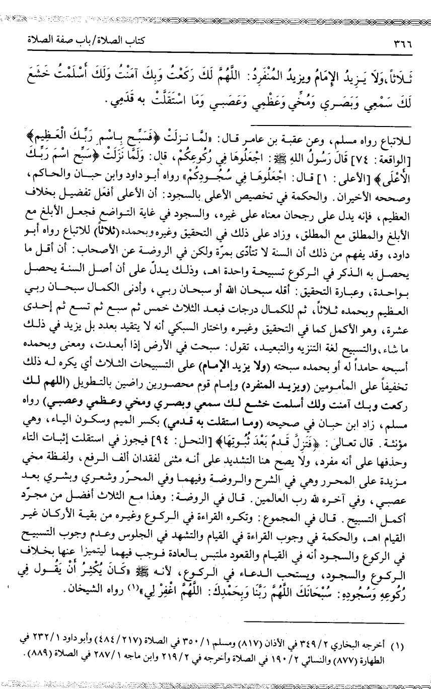 (وَلَا يَزِيدُ الْإِمَامُ) عَلَى التَّسْبِيحَاتِ الثَّلَاثِ أَيْ يُكْرَهُ لَهُ ذَلِكَ تَخْفِيفًا عَلَى الْمَأْمُومِينَ (وَيَزِيدُ الْمُنْفَرِدُ) وَإِمَامُ قَوْمٍ مَحْصُورِينَ رَاضِينَ بِالتَّطْوِيلِ «اللَّهُمَّ لَكَ رَكَعْتُ وَبِكَ آمَنْتُ وَلَكَ أَسْلَمْتُ خَشَعَ لَكَ سَمْعِي وَبَصَرِي وَمُخِّي وَعَظْمِي وَعَصَبِي» رَوَاهُ مُسْلِمٌ، زَادَ ابْنُ حِبَّانَ فِي صَحِيحِهِ (وَمَا اسْتَقَلَّتْ بِهِ قَدَمِي) بِكَسْرِ الْمِيمِ وَسُكُونِ الْيَاءِ، وَهِيَ مُؤَنَّثَةٌ.