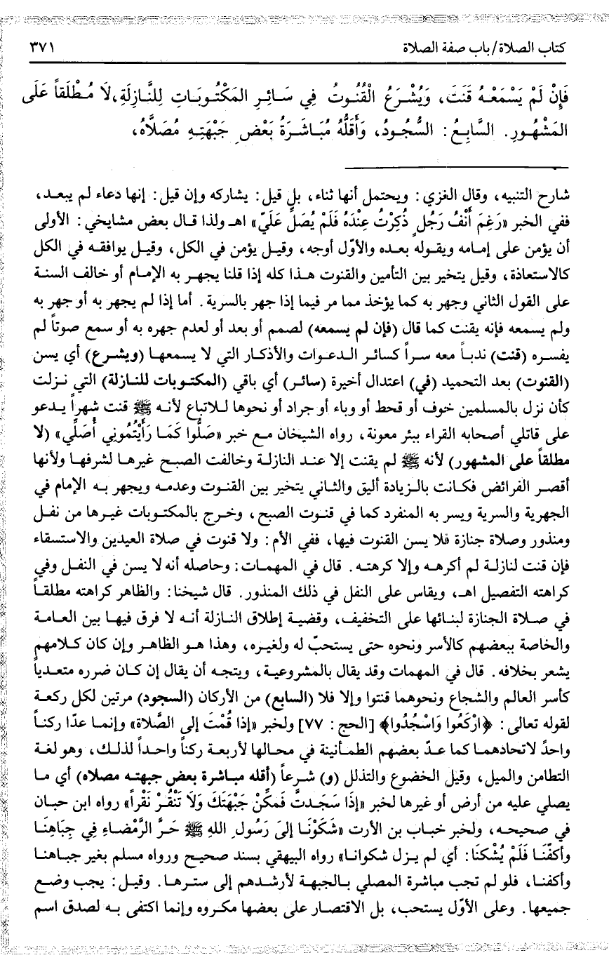 وَيُشْرَعُ الْقُنُوتُ فِي سَائِرٍ الْمَكْتُوبَاتِ لِلنَّازِلَةِ، لَا مُطْلَقًا عَلَى الْمَشْهُورِ.
