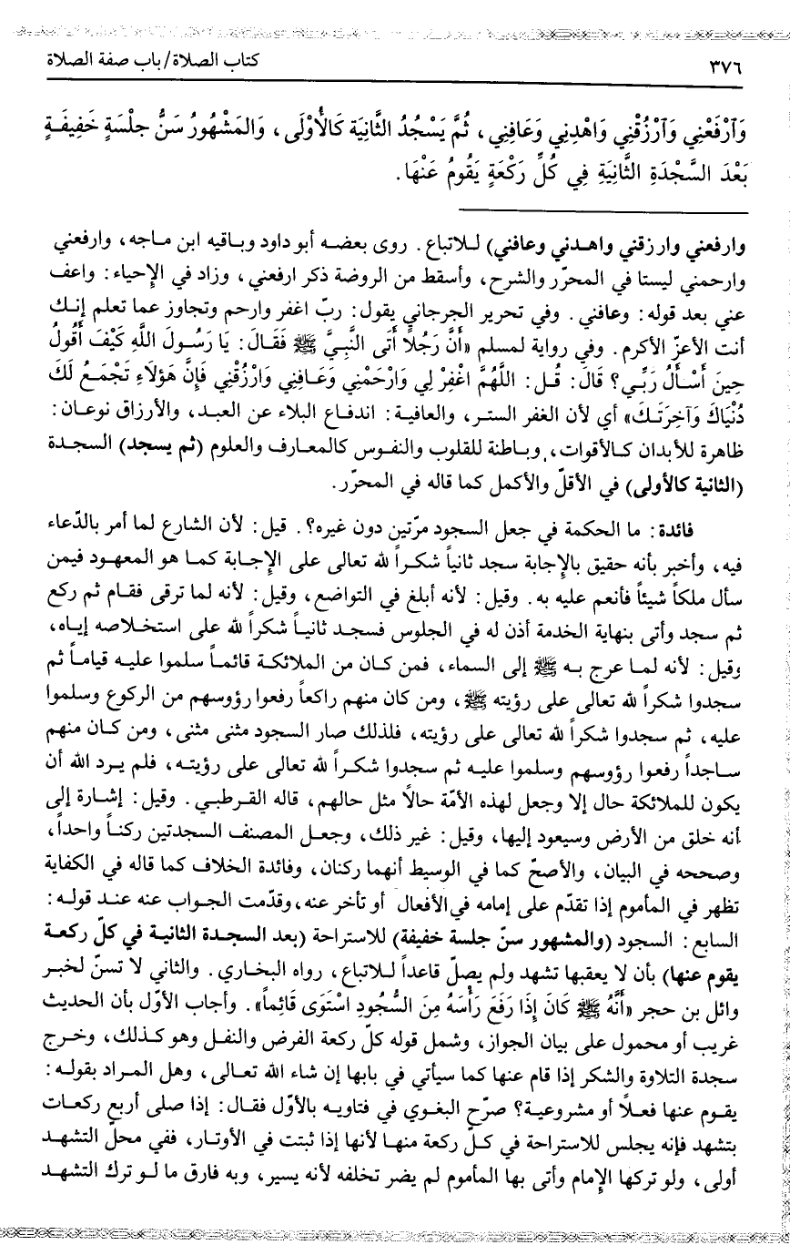 وَفِي رِوَايَةٍ لِمُسْلِمٍ «أَنَّ رَجُلًا أَتَى النَّبِيَّ - صَلَّى اللَّهُ عَلَيْهِ وَسَلَّمَ - فَقَالَ: يَا رَسُولَ اللَّهِ كَيْفَ أَقُولُ حِينَ أَسْأَلُ رَبِّي؟ قَالَ: قُلْ: اللَّهُمَّ اغْفِرْ لِي وَارْحَمْنِي وَعَافَنِي وَارْزُقْنِي فَإِنَّ هَؤُلَاءِ تَجْمَعُ لَكَ دُنْيَاكَ وَآخِرَتَكَ» أَيْ؛ لِأَنَّ الْغَفْرَ السِّتْرُ، وَالْعَافِيَةَ: انْدِفَاعُ الْبَلَاءِ عَنْ الْعَبْدِ، وَالْأَرْزَاقُ نَوْعَانِ: ظَاهِرَةٌ لِلْأَبْدَانِ كَالْأَقْوَاتِ، وَبَاطِنَةٌ لِلْقُلُوبِ وَالنُّفُوسِ كَالْمَعَارِفِ وَالْعُلُومِ (ثُمَّ يَسْجُدُ) السَّجْدَةَ (الثَّانِيَةَ كَالْأُولَى) فِي الْأَقَلِّ وَالْأَكْمَلِ كَمَا قَالَهُ فِي الْمُحَرَّرِ.