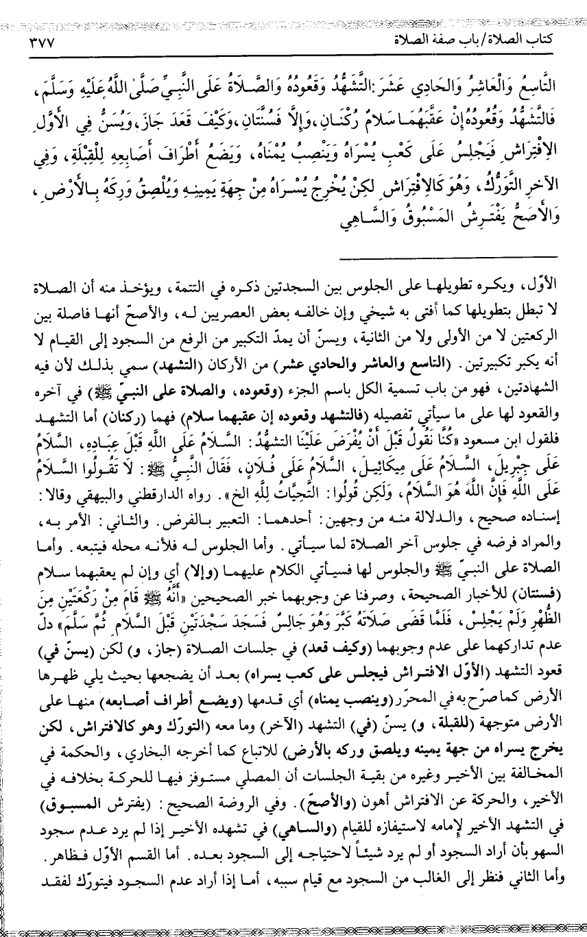 التَّاسِعُ وَالْعَاشِرُ وَالْحَادِيَ عَشَرَ: التَّشَهُّدُ وَقُعُودُهُ وَالصَّلَاةُ عَلَى النَّبِيِّ - صَلَّى اللَّهُ عَلَيْهِ وَسَلَّمَ - فَالتَّشَهُّدُ وَقُعُودُهُ إنْ عَقِبَهُمَا سَلَامٌ رُكْنَانِ، وَإِلَّا فَسُنَّتَانِ، وَكَيْفَ قَعَدَ جَازَ، وَيُسَنُّ فِي الْأَوَّلِ الِافْتِرَاشُ فَيَجْلِسُ عَلَى كَعْبِ يُسْرَاهُ وَيَنْصِبُ يُمْنَاهُ، وَيَضَعَ أَطْرَافَ أَصَابِعِهِ لِلْقِبْلَةِ، وَفِي الْآخَرِ التَّوَرُّكُ، وَهُوَ كَالِافْتِرَاشِ، لَكِنْ يُخْرِجُ يُسْرَاهُ مِنْ جِهَةِ يَمِينِهِ وَيُلْصِقُ وَرِكَهُ بِالْأَرْضِ، وَالْأَصَحُّ يَفْتَرِشُ الْمَسْبُوقُ وَالسَّاهِي