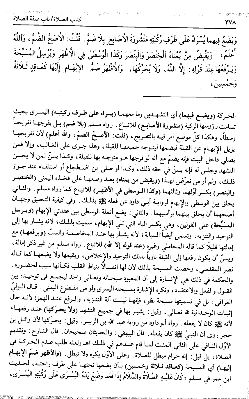وَقِيلَ: يُحَرِّكُهَا؛ لِأَنَّ وَائِلَ بْنَ حُجْرٍ رَوَى أَنَّ النَّبِيَّ - صَلَّى اللَّهُ عَلَيْهِ وَسَلَّمَ - كَانَ يَفْعَلُهُ، قَالَ الْبَيْهَقِيُّ: وَالْحَدِيثَانِ صَحِيحَانِ، قَالَ الشَّارِحُ: وَتَقْدِيمُ الْأَوَّلِ النَّافِي عَلَى الثَّانِي الْمُثْبِتِ لِمَا قَامَ عِنْدَهُمْ فِي ذَلِكَ اهـ.