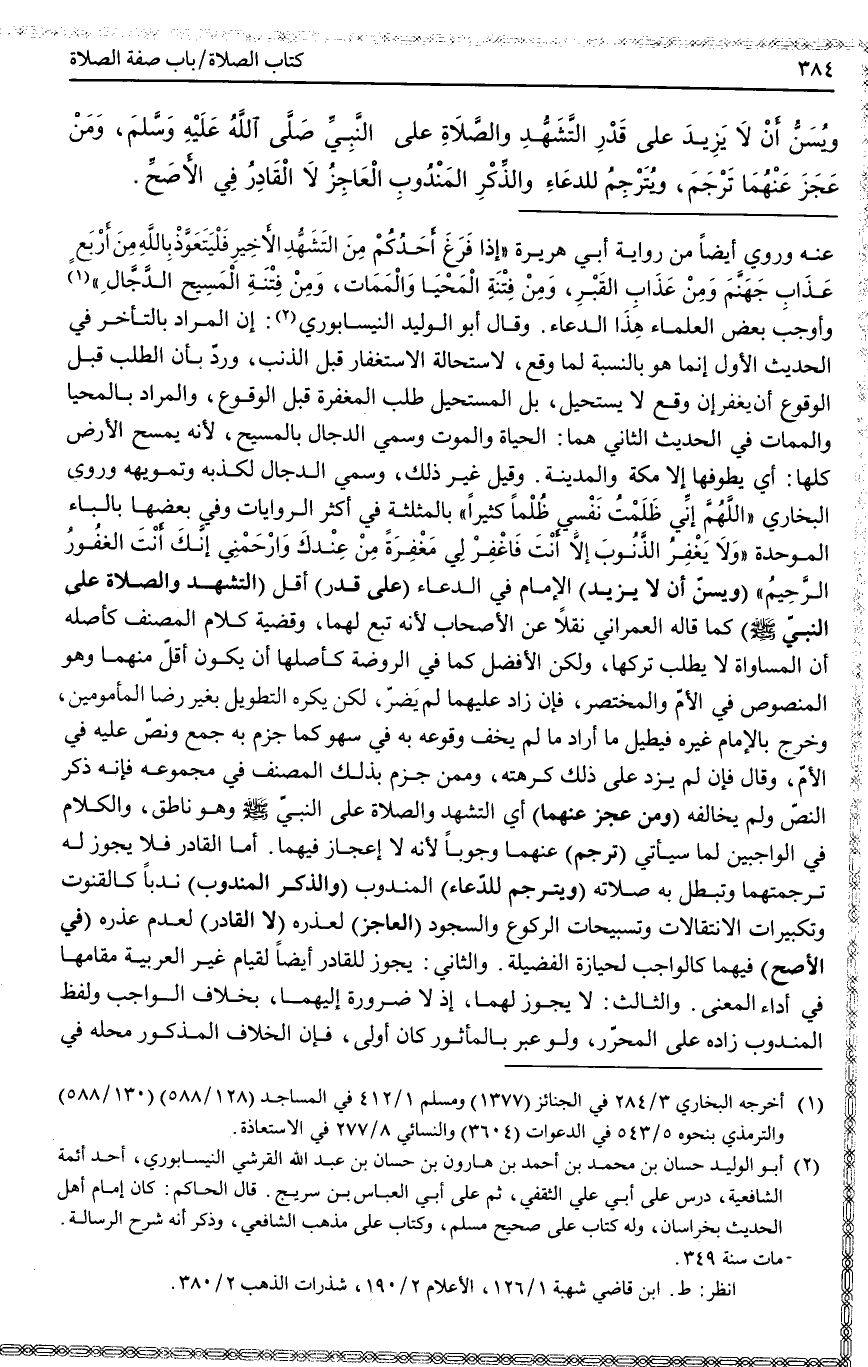 ـــــــــــــــــــــــــــــQوَرُوِيَ أَيْضًا مِنْ رِوَايَةِ أَبِي هُرَيْرَةَ «إذَا فَرَغَ أَحَدُكُمْ مِنْ التَّشَهُّدِ الْأَخِيرِ، فَلْيَتَعَوَّذْ بِاَللَّهِ مِنْ أَرْبَعٍ عَذَابِ جَهَنَّمَ وَمِنْ عَذَابِ الْقَبْرِ، وَمِنْ فِتْنَةِ الْمَحْيَا وَالْمَمَاتِ، وَمِنْ فِتْنَةِ الْمَسِيحِ الدَّجَّالِ» (1) وَأَوْجَبَ بَعْضُ الْعُلَمَاءِ هَذَا الدُّعَاءَ.