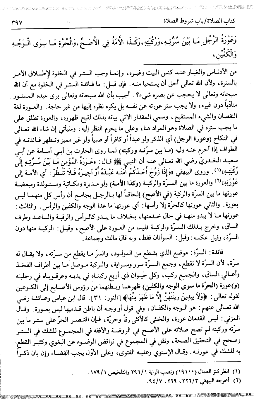 وَعَوْرَةُ الرَّجُلِ مَا بَيْنَ سُرَّتِهِ، وَرُكْبَتِهِ، وَكَذَا الْأَمَةُ فِي الْأَصَحِّ، وَالْحَرَّةُ مَا سِوَى الْوَجْهِ وَالْكَفَّيْنِ.