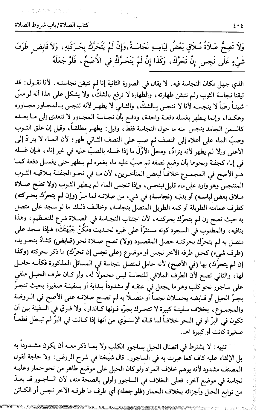 (، وَلَا) تَصِحُّ صَلَاةُ نَحْوِ (قَابِضٍ) كَشَادٍّ بِنَحْوِ يَدِهِ (طَرَفَ شَيْءٍ) كَحَبْلٍ طَرَفُهُ الْآخَرُ نَجَسٌ أَوْ مَوْضُوعٌ (عَلَى نَجَسٍ إنْ تَحَرَّكَ) مَا ذُكِرَ بِحَرَكَتِهِ (وَكَذَا إنْ لَمْ يَتَحَرَّكْ) بِهَا (فِي الْأَصَحِّ) لِأَنَّهُ حَامِلٌ لِمُتَّصِلٍ بِنَجَاسَةٍ فِي الْمَسَائِلِ الْمَذْكُورَةِ، فَكَأَنَّهُ حَامِلٌ لَهَا، وَالثَّانِي تَصِحُّ؛ لِأَنَّ الطَّرَفَ الْمُلَاقِيَ لِلنَّجَاسَةِ لَيْسَ مَحْمُولًا لَهُ، وَلَوْ كَانَ طَرَفُ الْحَبْلِ مُلْقًى عَلَى سَاجُورِ نَحْوِ كَلْبٍ، وَهُوَ مَا يُجْعَلُ فِي عُنُقِهِ أَوْ مَشْدُودًا بِدَابَّةٍ أَوْ بِسَفِينَةٍ صَغِيرَةٍ بِحَيْثُ تَنْجَرُّ بِجَرِّ الْحَبْلِ أَوْ قَابِضِهِ يَحْمِلَانِ نَجَسًا أَوْ مُتَّصِلًا بِهِ لَمْ تَصِحَّ صَلَاتُهُ عَلَى الْأَصَحِّ فِي الرَّوْضَةِ وَالْمَجْمُوعِ، بِخِلَافِ سَفِينَةٍ كَبِيرَةٍ لَا تَتَحَرَّكُ بِجَرِّهِ فَإِنَّهَا كَالدَّارِ، وَلَا فَرْقَ فِي السَّفِينَةِ بَيْنَ أَنْ تَكُونَ فِي الْبَرِّ أَوْ فِي الْبَحْرِ خِلَافًا لِمَا قَالَهُ الْإِسْنَوِيُّ مِنْ أَنَّهَا إذَا كَانَتْ فِي الْبَرِّ لَمْ تَبْطُلْ قَطْعًا صَغِيرَةً كَانَتْ أَوْ كَبِيرَةً. اهـ.